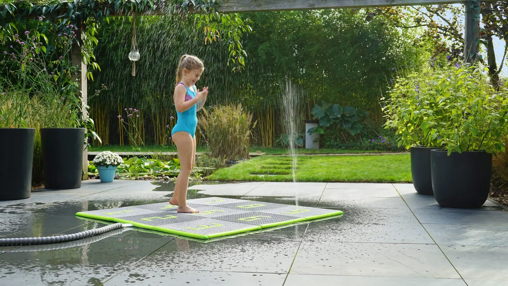 Aan veiligheid is natuurlijk ook gedacht. Zo hebben de Sprinqle tegels een speciale anti-slip structuur en de groenkleurige omranding van de tegels dekt ieder hoekje zorgvuldig af. Ook kun je dankzij de drukregelaar op het bedieningspaneel zelf bepalen hoe hoog de waterstralen mogen komen, zodat zelfs de allerkleinsten met de Sprinqle kunnen spelen. De Sprinqle water speeltegels van EXIT Toys zorgen voor buitengewoon veel waterpret in eigen tuin.