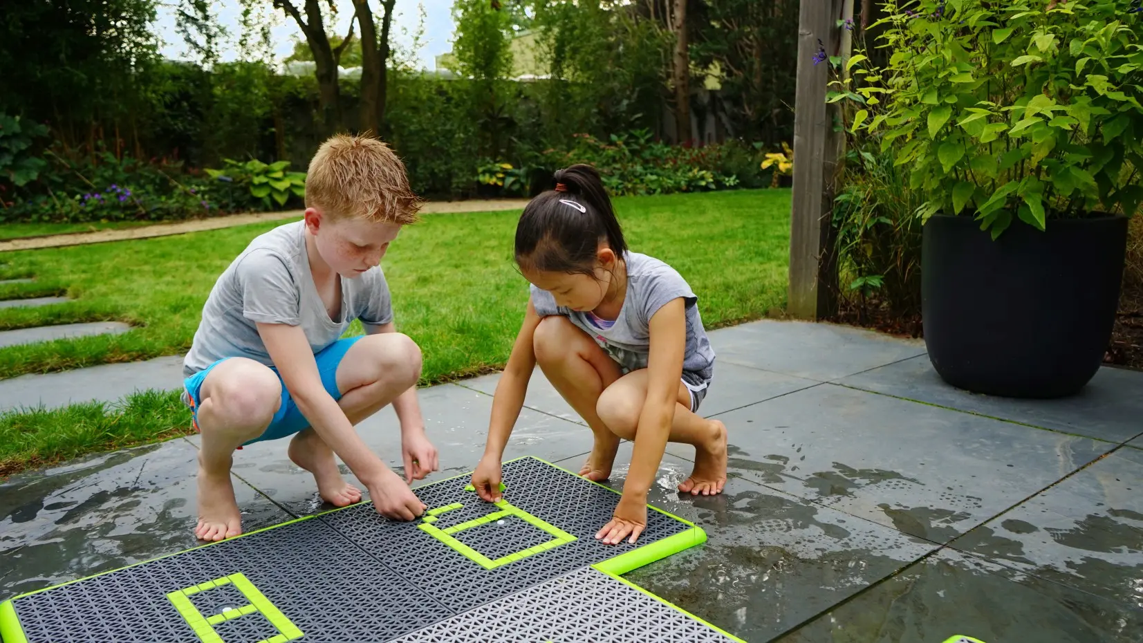 De Sprinqle water speeltegels van EXIT Toys zijn eenvoudig te monteren en kun je in een vierkant of hinkelpad neerleggen. Bedenk vooraf in welke vorm jij de tegels wil hebben, klik ze vervolgens met de koppelstukken aan elkaar en sluit de spuitmonden aan op het bedieningspaneel. Met de vierkante EXIT klik-blokjes versier je tot slot de tegels met cijfers of vrolijke figuren en maak je jouw ontwerp helemaal af. En wil je later toch van vorm switchen? Dan bouw je de Sprinqle net zo snel weer om.