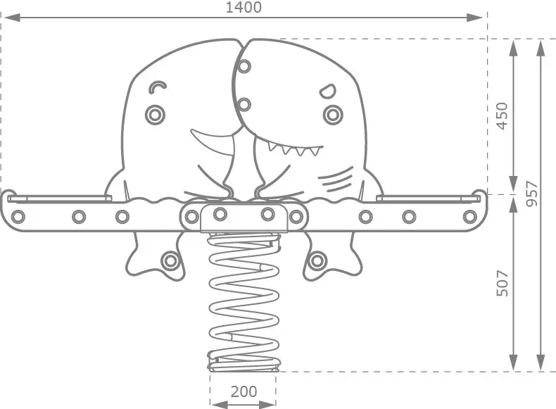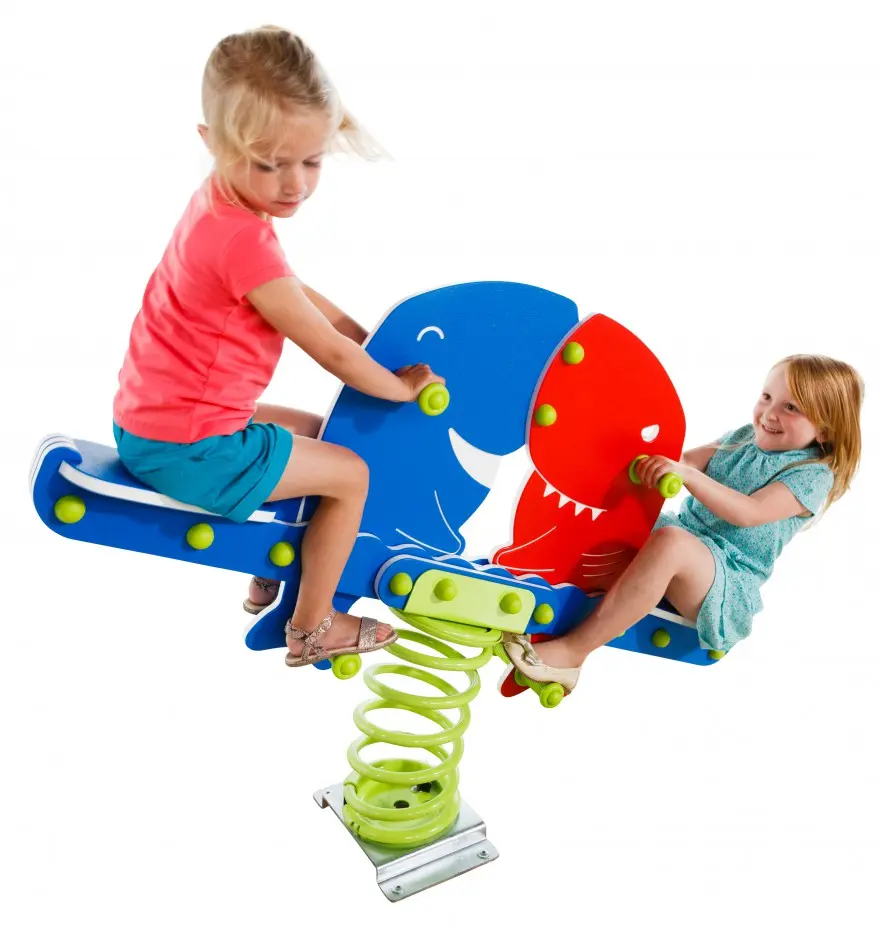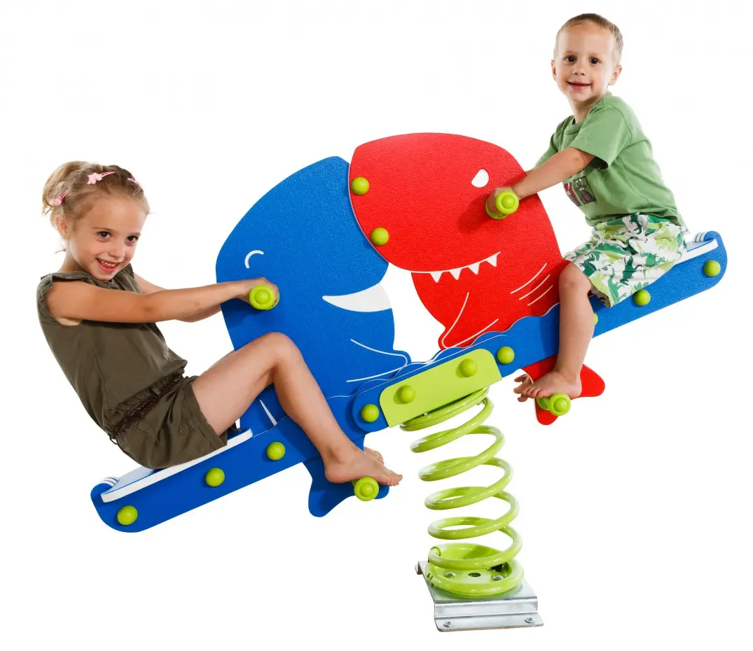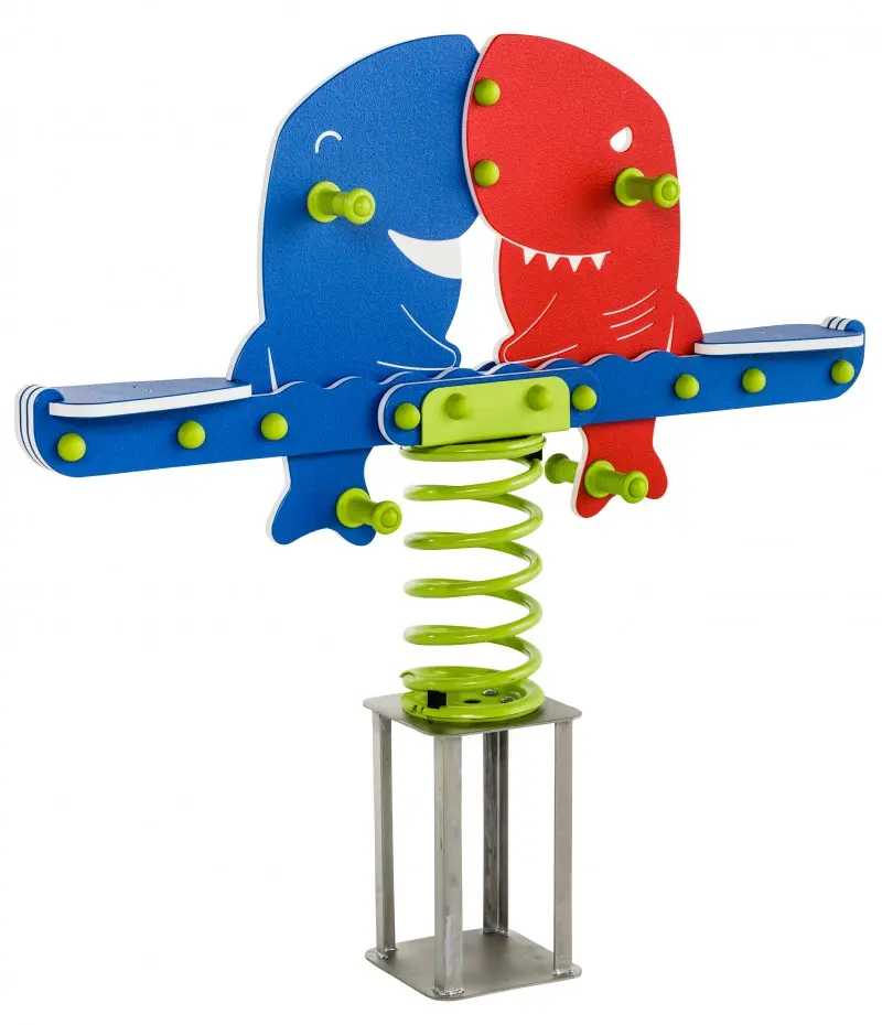 Wipkip Haaien tweeling is geschikt voor 2 kinderen tegelijk, door de 2 volwaardige zitjes. Deze veerwip is een echte aanvulling voor professionele speelplaatsen. Met deze unieke wipkip wordt dubbel speelpret beleefd! De wip is een stevig en robuust speeltoestel.