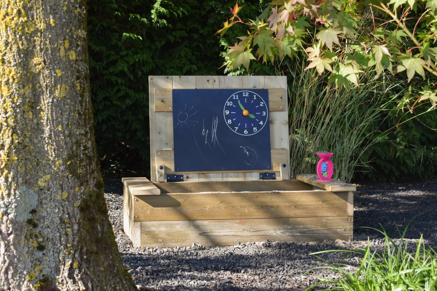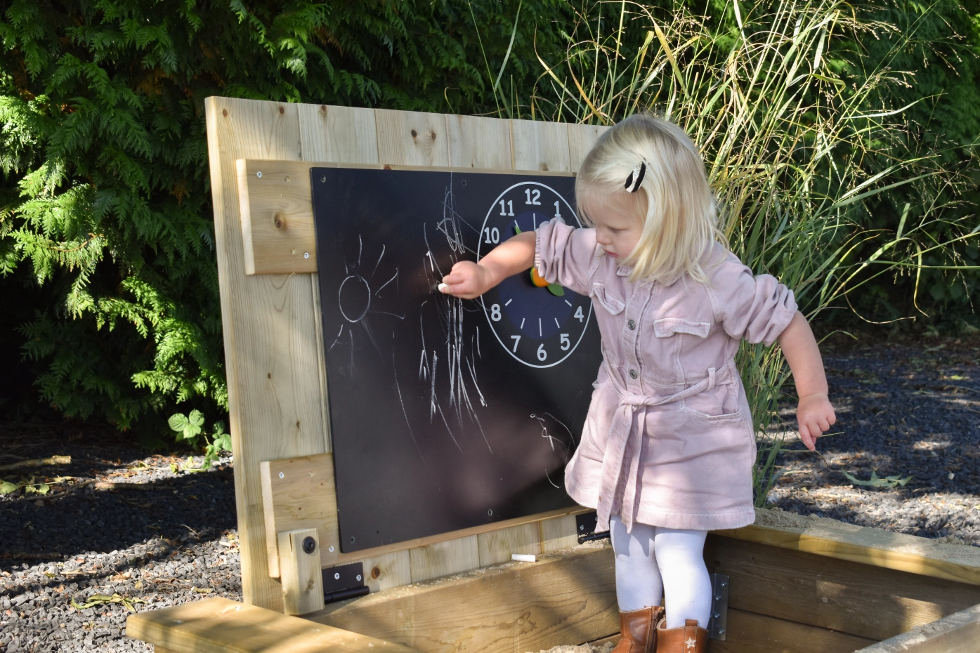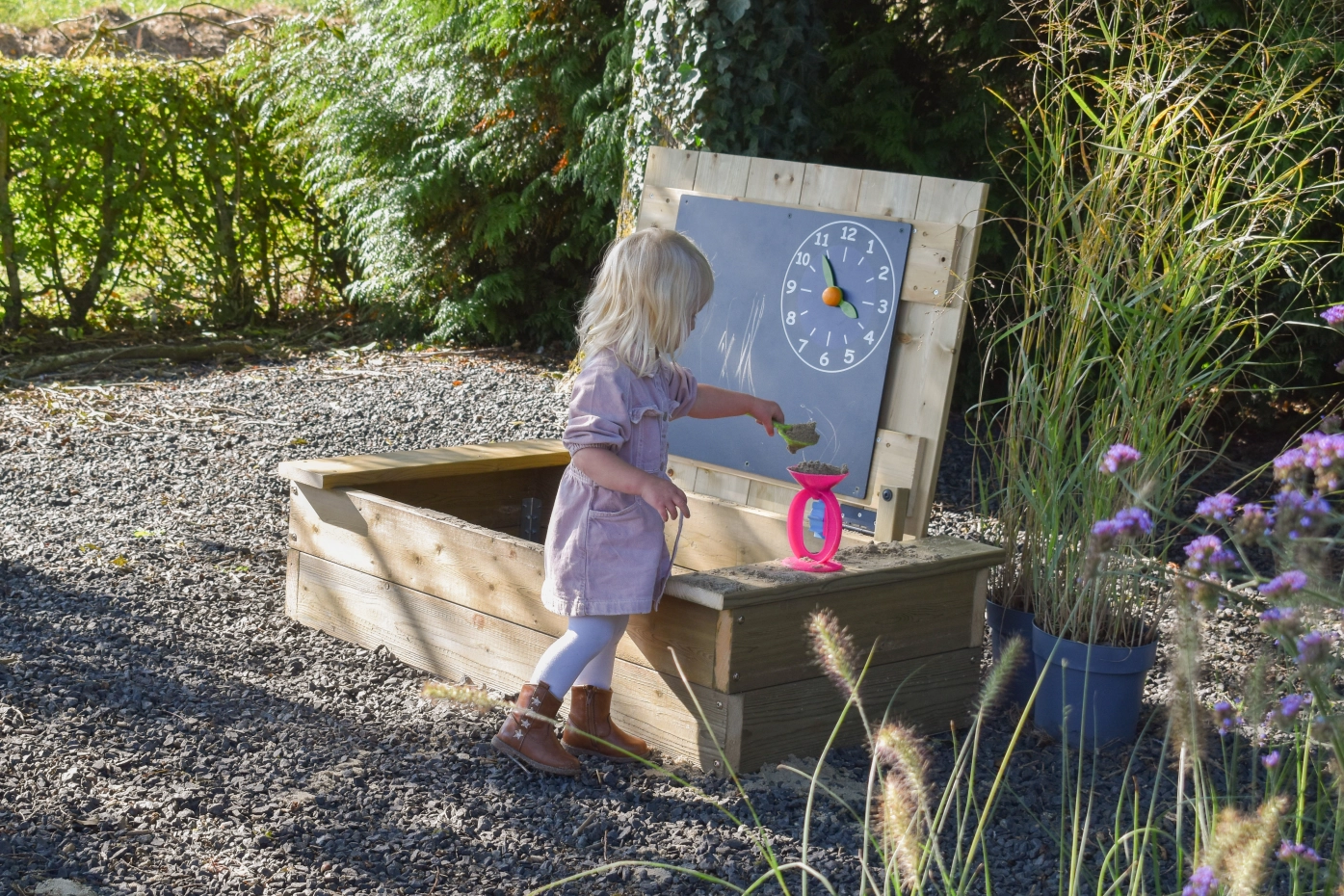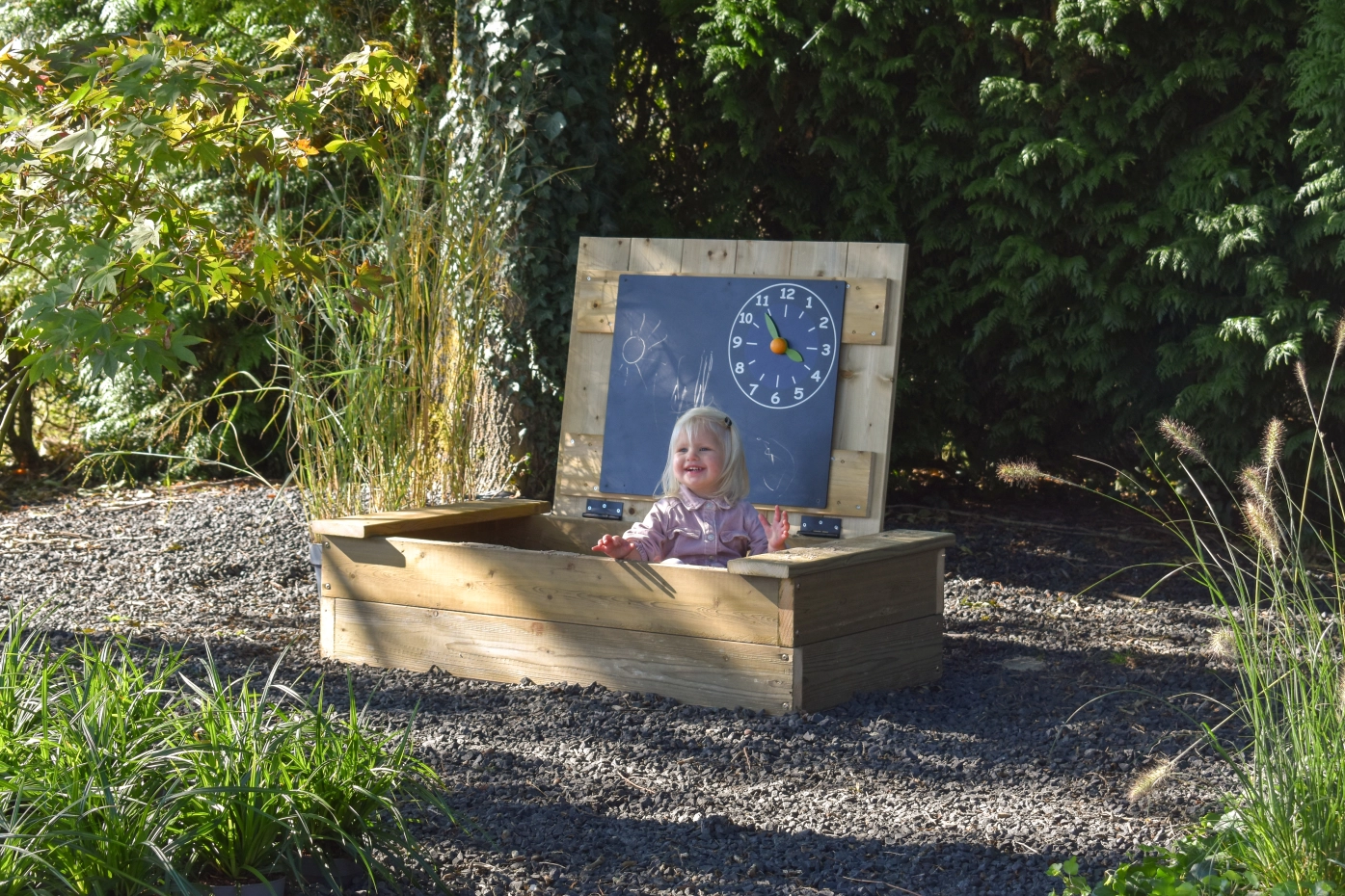 Zandbak Compact met deksel en krijtbord: is een robuuste, houten zandbak van geïmpregneerd vurenhout! Klein van formaat, groots in speelplezier! Het slimme zandbakdeksel klap je eenvoudig open dankzij de handige overstek aan de voorkant – veilig en zonder geklemde vingers. Dit stoere ontwerp biedt niet alleen een stevige speelplek met 2 bankjes, maar wordt geleverd met een leuk krijtbord-met-klok dat je zo aan de zandbak bevestigt voor nog meer speelplezier! En met ruimte voor ongeveer 100 kg zand kunnen er eindeloos zandtaartjes gemaakt worden!