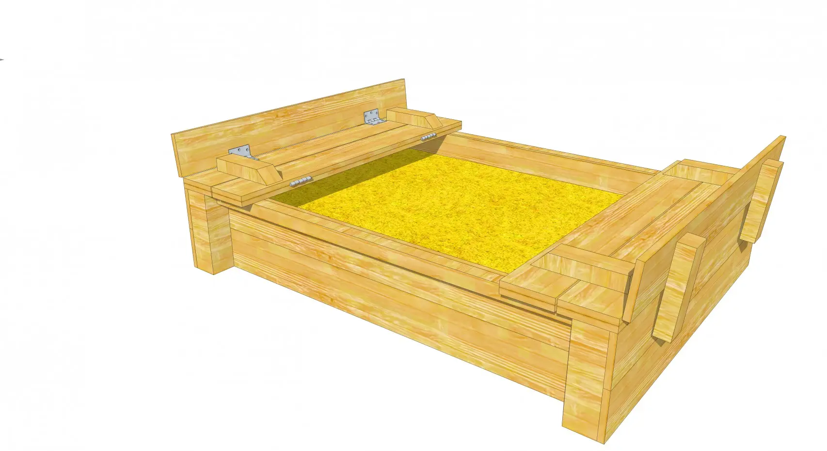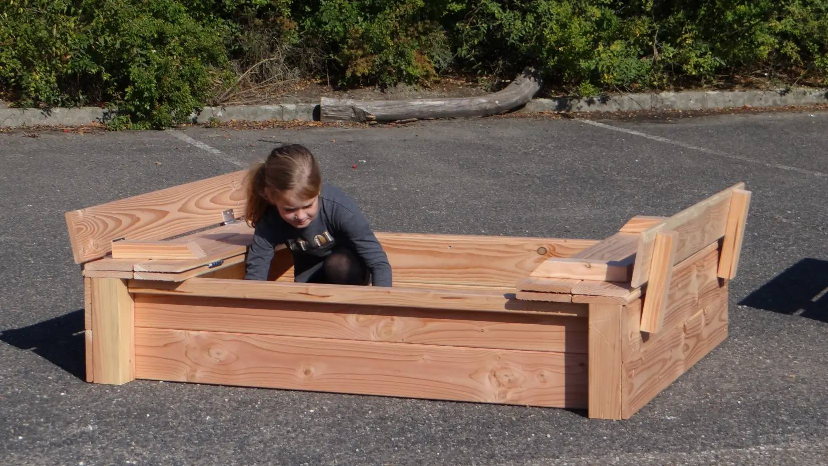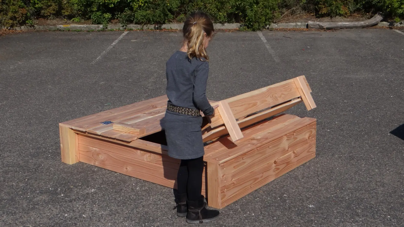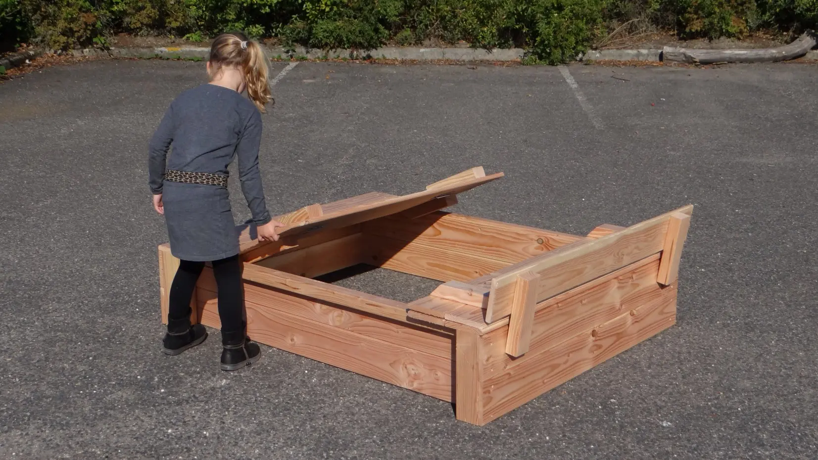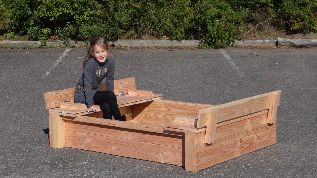 - Het deksel van de zandbak is eenvoudig op te klappen, zodat er 2 bankjes ontstaan