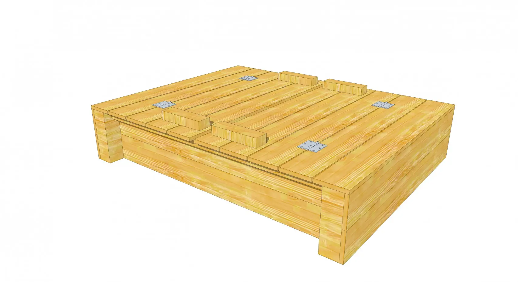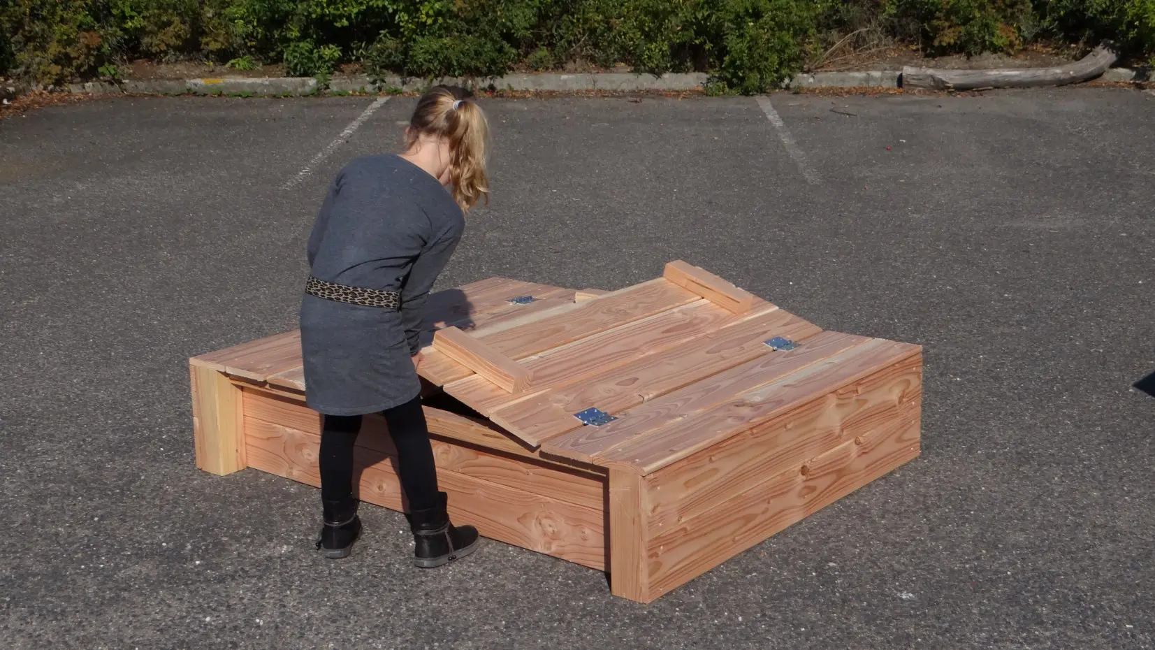 - Omdat het deksel aan de zijkanten wat oversteekt, hoef je niet met je vingers tussen het hout om de zandbak te openen en te sluiten