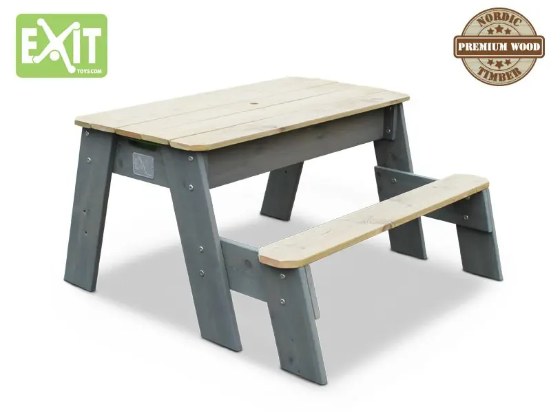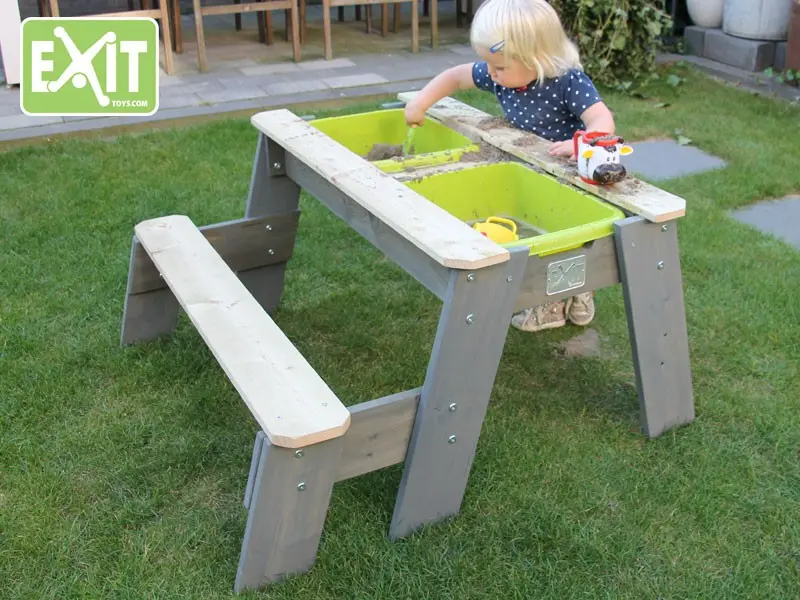 De zand, water en picknicktafel is een multifunctionele tafel. Door het afneembare tafelblad kan er op het ene moment gespeeld worden met zand en water, op het andere moment kan er lekker aan geknutseld worden. De twee geïntegreerde bakken zijn groen van kleur en bovendien uitneembaar, hierdoor zijn ze makkelijk schoon te maken. Door zijn rustige kleuren en moderne uiterlijk staat de tafel erg mooi in ieder tuin! De tafel is uitgevoerd met een zitbankje.