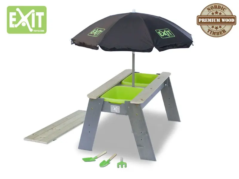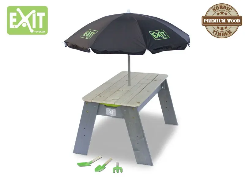 Deze EXIT zand en watertafel is multifunctioneel. Onder het afneembare tafelblad zit een zandbak! Daarnaast bevindt zich nog een bak die bijvoorbeeld gevuld kan worden met water. Zo kunnen de kinderen met zand of met water spelen, dit valt natuurlijk ook te combineren. Als de kinderen uitgespeeld zijn kan het tafelblad terug geschoven worden zodat het weer een echte picknicktafel word. De geïntegreerde bakken zijn uitneembaar zodat ze makkelijk schoongemaakt kunnen worden. Met de meegeleverde EXIT Parasol zitten de kinderen ook nog eens lekker in de schaduw op zonnige dagen en met het meegeleverde tuingereedschap kan er heerlijk in het zand gespeel worden!