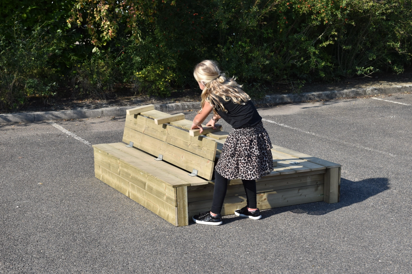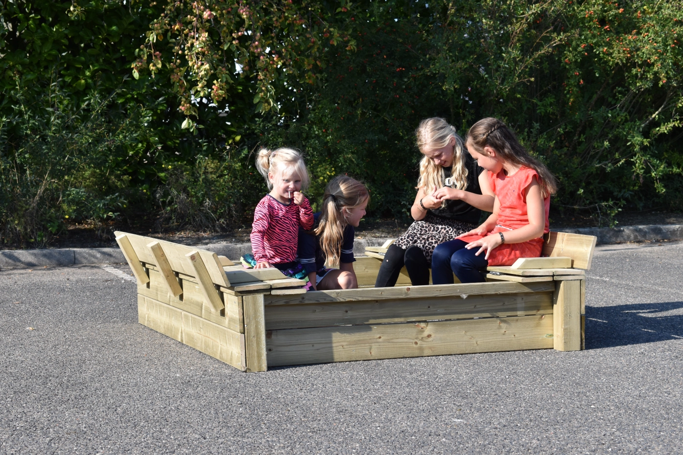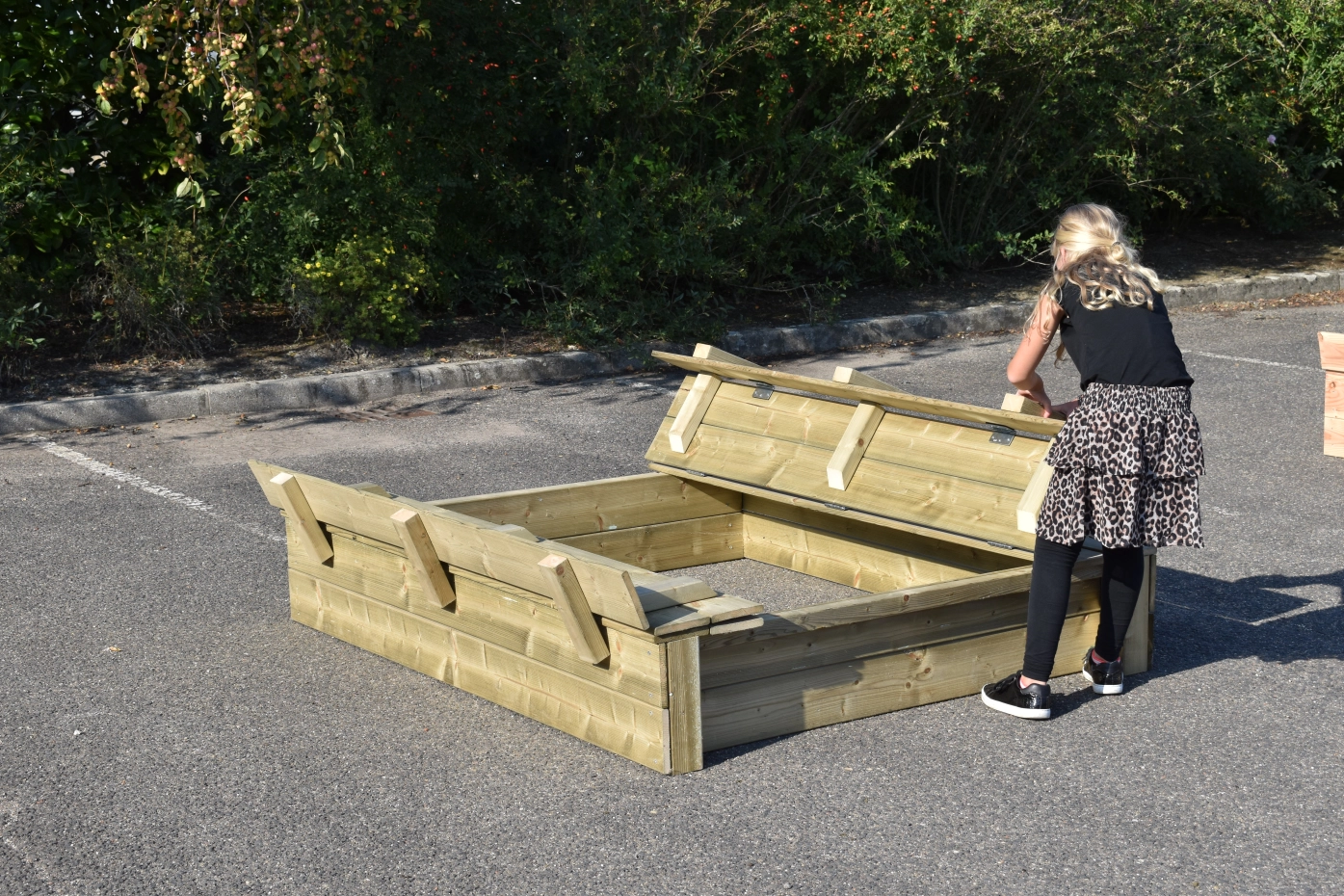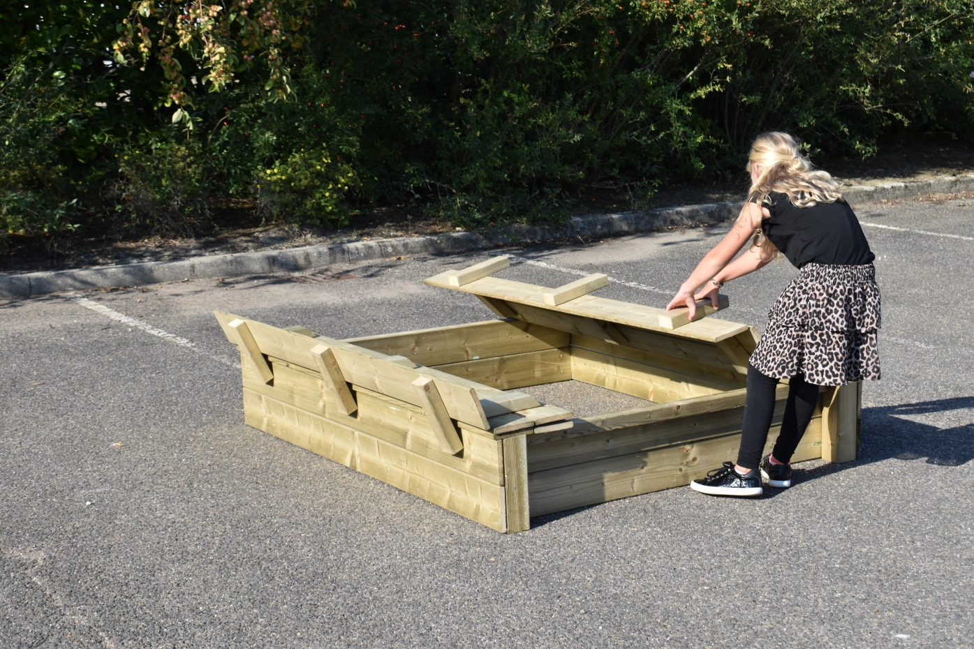 - Het deksel van de zandbak is eenvoudig op te klappen, zodat er 2 bankjes ontstaan
