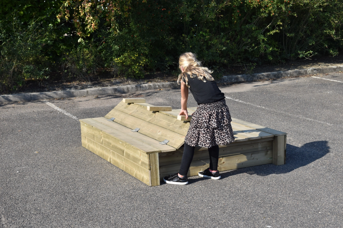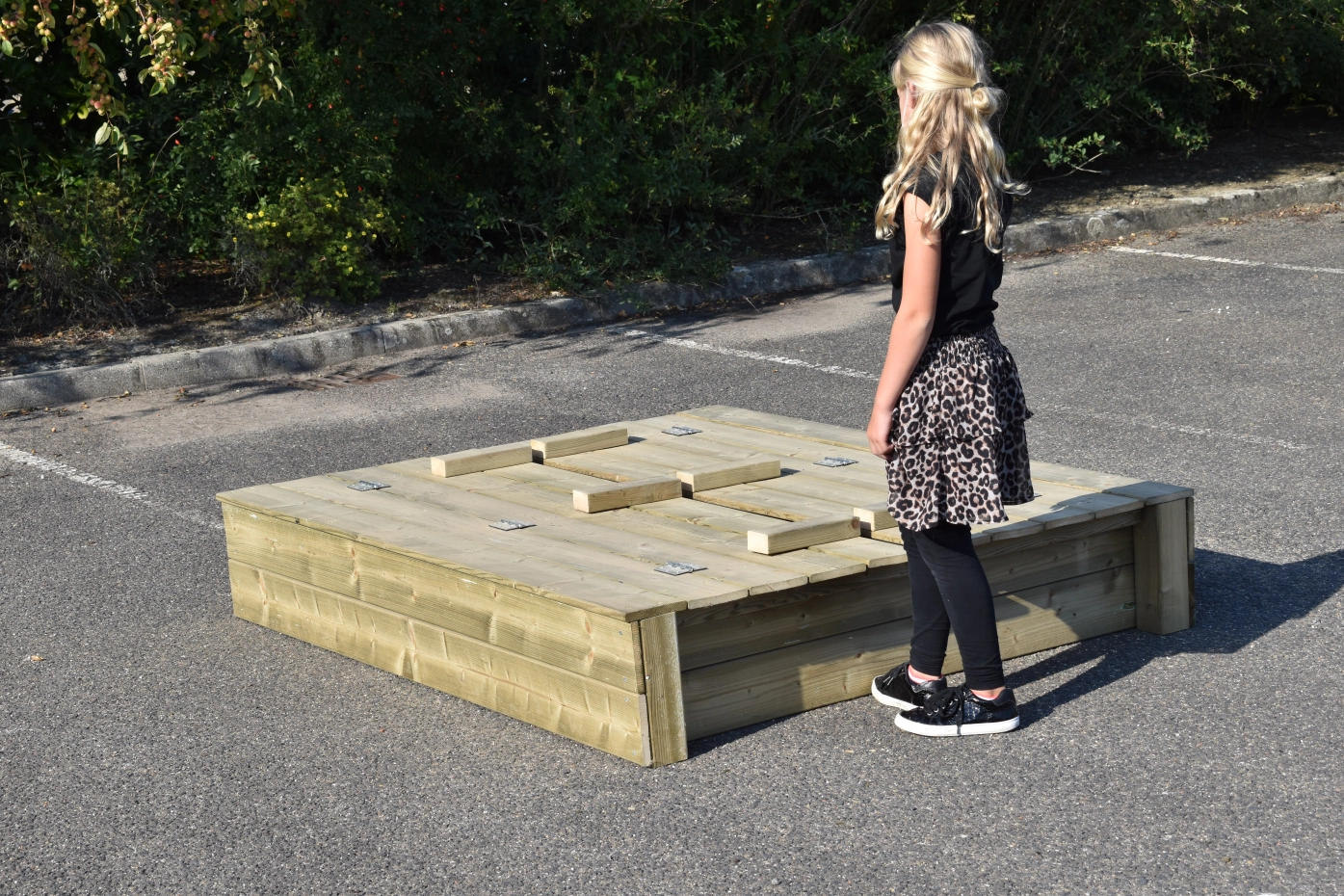 - Omdat het deksel aan de zijkanten wat oversteekt, hoef je niet met je vingers tussen het hout om de zandbak te openen en te sluiten