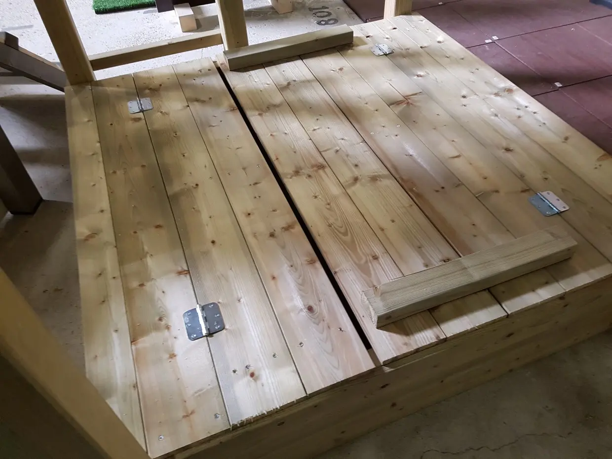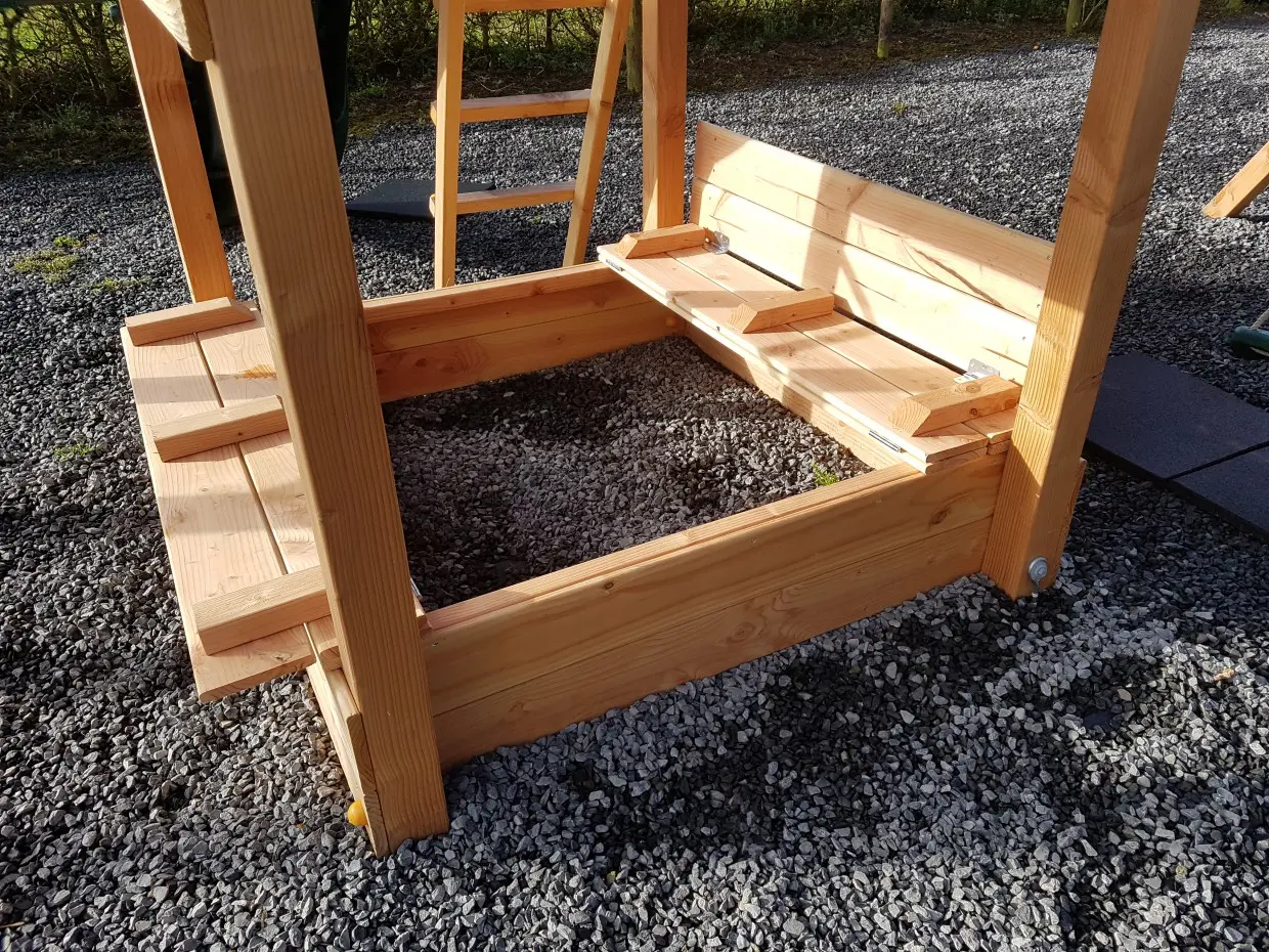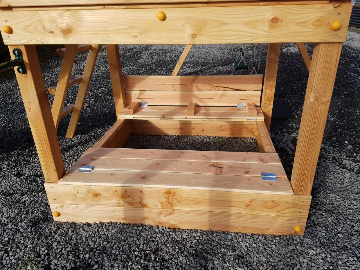 Zandbak deksel voor de Blue Rabbit speeltoren Pagoda. Hiermee beschermt u het zand tegen bijvoorbeeld katten. Het zandbakdeksel kan eenvoudig worden opengeklapt tot een bank met rugleuning aan de ene kant en een bankje zonder rugleuning aan de andere kant van de zandbak.