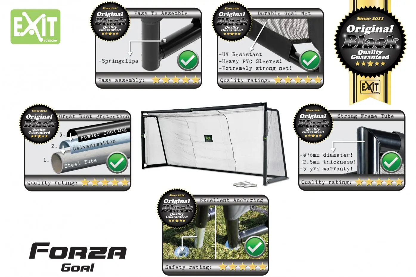 De Forza, een prachtig doel wat in iedere grote tuin weerstaat. Met het zwarte frame en net is de Forza in iedere tuin een juweel. Het verzinkte en gepoedercoate frame is uiterst robuust. Het fijnmazige net zorgt ervoor dat dit goal afgemaakt wordt. De stevige verankering zorgt ervoor dat de Forza altijd stevig blijft staan, en als u het gras wilt maaien tilt u hem even uit de verankering. Oftewel, een stevig en praktisch goal voor veel voetbal plezier.