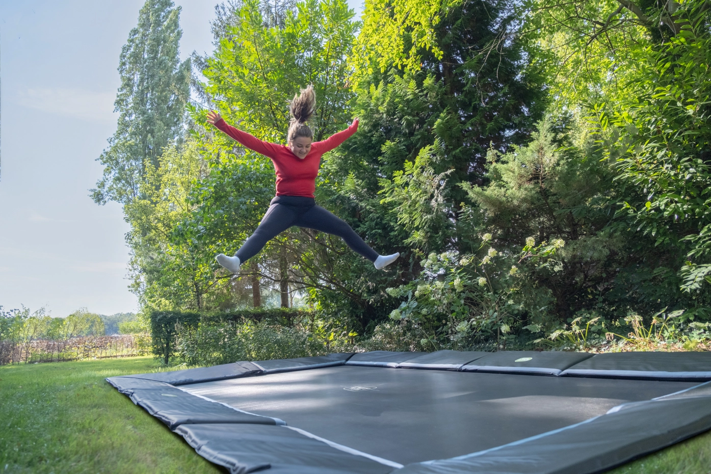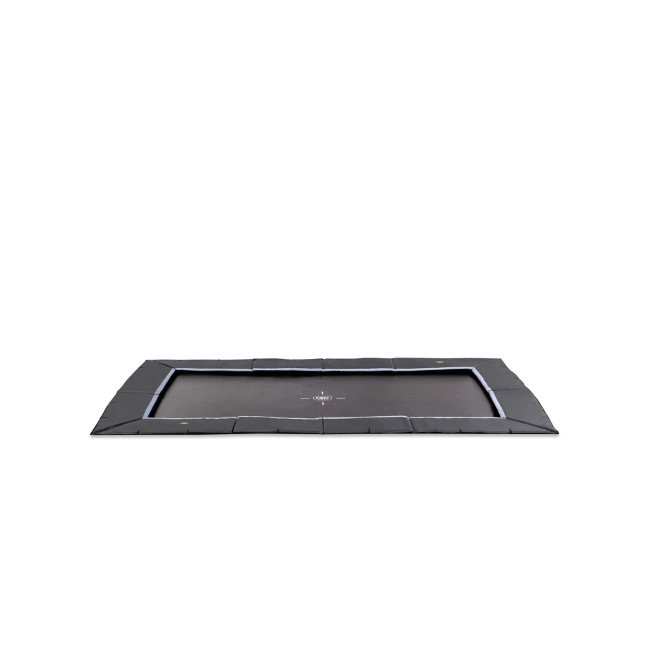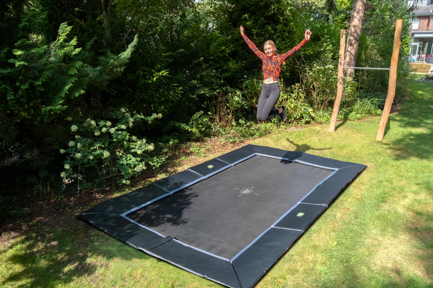 De EXIT Dynamic groundlevel sports trampoline 244x427 cm is een matzwarte, rechthoekige ingraaftrampoline voor sportieve springers vanaf 14 jaar. Dankzij de 25 cm lange dubbel conische veren spring je krachtig en gecontroleerd, perfect voor tricks en hoge sprongen. Het robuuste frame met 42 mm dikke toprail blijft stevig staan, ook bij intensief gebruik. Gegalvaniseerd en gepoedercoat voor langdurige bescherming tegen weer en roest – dé trampoline voor serieuze springprestaties!