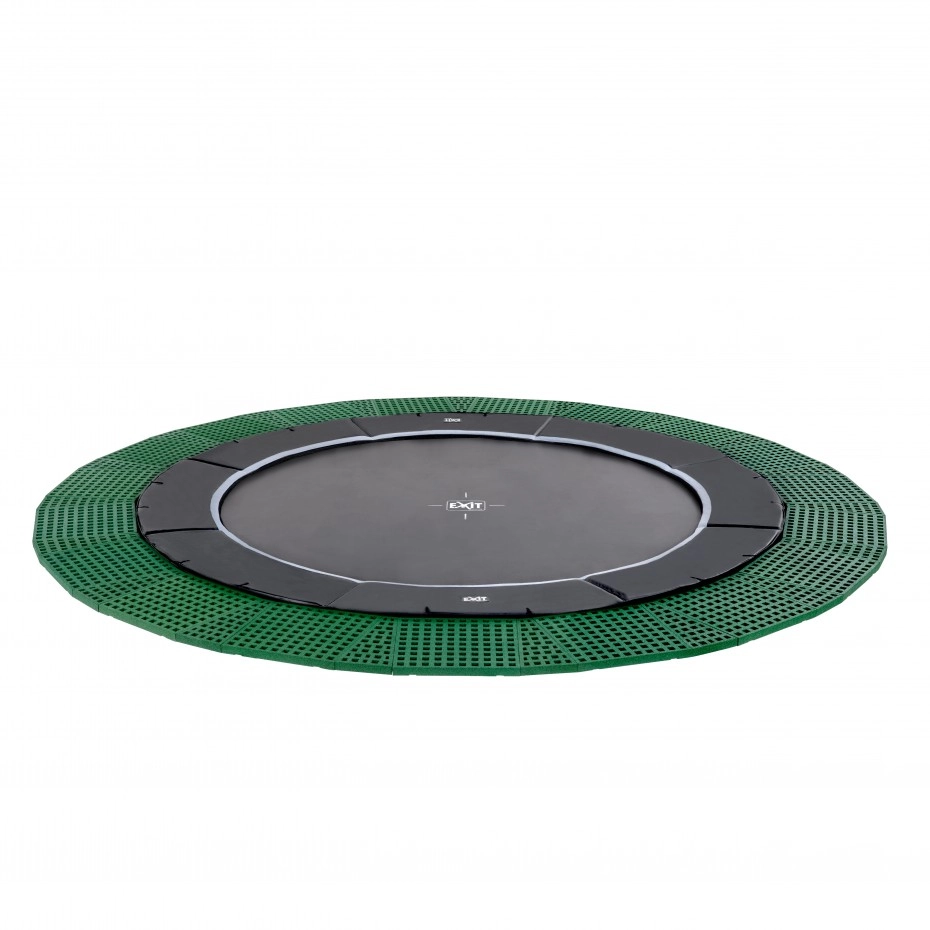 De trampoline EXIT Dynamic groundlevel is een ronde, matzwarte ingraaftrampoline van absolute topkwaliteit. Deze stevige trampoline wordt standaard geleverd met unieke Freezone veiligheidstegels voor een optimale bescherming rondom. Kinderen met veel springervaring tillen hun vaardigheden moeiteloos naar een hoger level, want deze trampoline heeft dubbel conische veren van maar liefst 25 cm lang. Toch blijft de trampoline bij de hoogste sprongen stevig op zijn plek, want het ultra stabiele frame is wel 42mm dik. Ook is het frame gegalvaniseerd en gepoedercoat voor een optimale bescherming tegen weersinvloeden en roest. De luxe matzwarte uitvoering en subtiele kleurdetails geven de trampoline een stijlvolle, moderne uitstraling. En het voordeel van een groundlevel trampoline is dat de beschermrand precies gelijkloopt met het gras, waardoor de trampoline volledig integreert met de rest van de tuin.