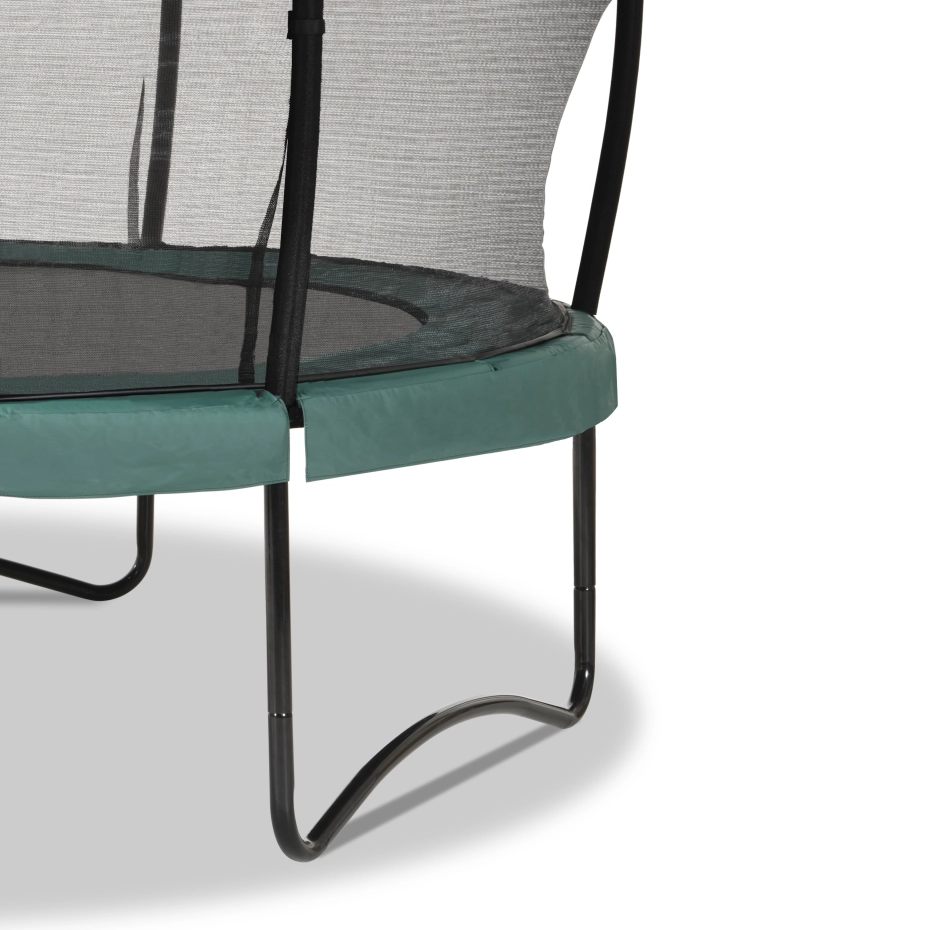 De EXIT Allure Classic trampoline is een trampoline met een beschermrand en een veiligheidsnet. Dankzij het EXIT Foot Protection System (FPS), een net tussen het springdoek en de trampoline beschermrand, komen trampolinespringers nooit met hun voeten tussen de springveren. Het meegeleverde veiligheidsnet heeft een overlappende ingang die automatisch sluit. Ook zijn de palen van het veiligheidsnet bedekt met schuim. Het trampolineframe is gegalvaniseerd en gepoedercoat en heeft daardoor een lange levensduur. Daarnaast is de beschermrand van deze trampoline voorzien van een beschermende, waterafstotende pvc-toplaag. Door middel van gebogen palen en een glasvezelring wordt het veiligheidsnet mooi strak in vorm gehouden. En last but not least: de Allure Classic trampoline heeft dubbel conische veren die zorgen voor een soepele sprong en een zachte landing.