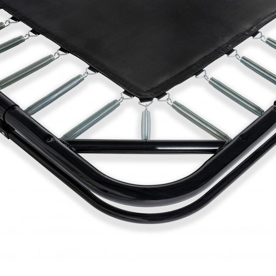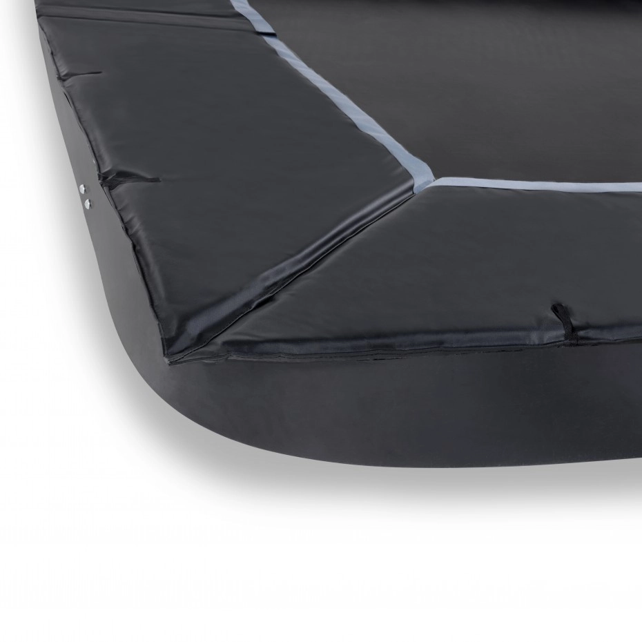 De trampoline EXIT Dynamic groundlevel is een rechthoekige, matzwarte ingraaftrampoline van absolute topkwaliteit. Deze stevige trampoline wordt standaard geleverd met unieke Freezone veiligheidstegels voor een optimale bescherming rondom. Kinderen met veel springervaring tillen hun vaardigheden moeiteloos naar een hoger level, want deze trampoline heeft dubbel conische veren van maar liefst 25 cm lang. Toch blijft de trampoline bij de hoogste sprongen stevig op zijn plek, want het ultra stabiele frame is wel 42mm dik. Ook is het frame gegalvaniseerd en gepoedercoat voor een optimale bescherming tegen weersinvloeden en roest. De luxe matzwarte uitvoering en subtiele kleurdetails geven de trampoline een stijlvolle, moderne uitstraling. En het voordeel van een groundlevel trampoline is dat de beschermrand precies gelijkloopt met het gras, waardoor de trampoline volledig integreert met de rest van de tuin.
