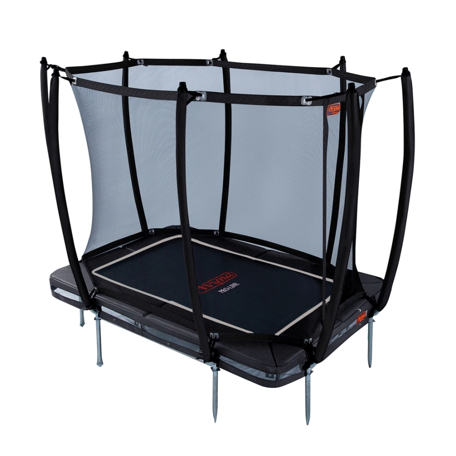 De Avyna PRO-LINE 213 InGround rechthoekige trampoline met afmetingen 275 x 190 cm en zwarte veiligheidsrand is voorzien van een soepele springmat en een sterk weerbestendig randkussen. Deze trampoline wordt standaard geleverd met veiligheidsnet.