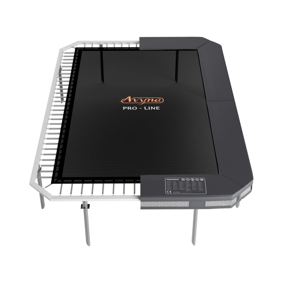 De Avyna PRO-LINE 223 InGround rechthoekige trampoline met afmetingen 305 x 225 cm en grijze veiligheidsrand is voorzien van een soepele springmat en een sterk weerbestendig grijs randkussen. Deze trampoline wordt standaard geleverd met veiligheidsnet.