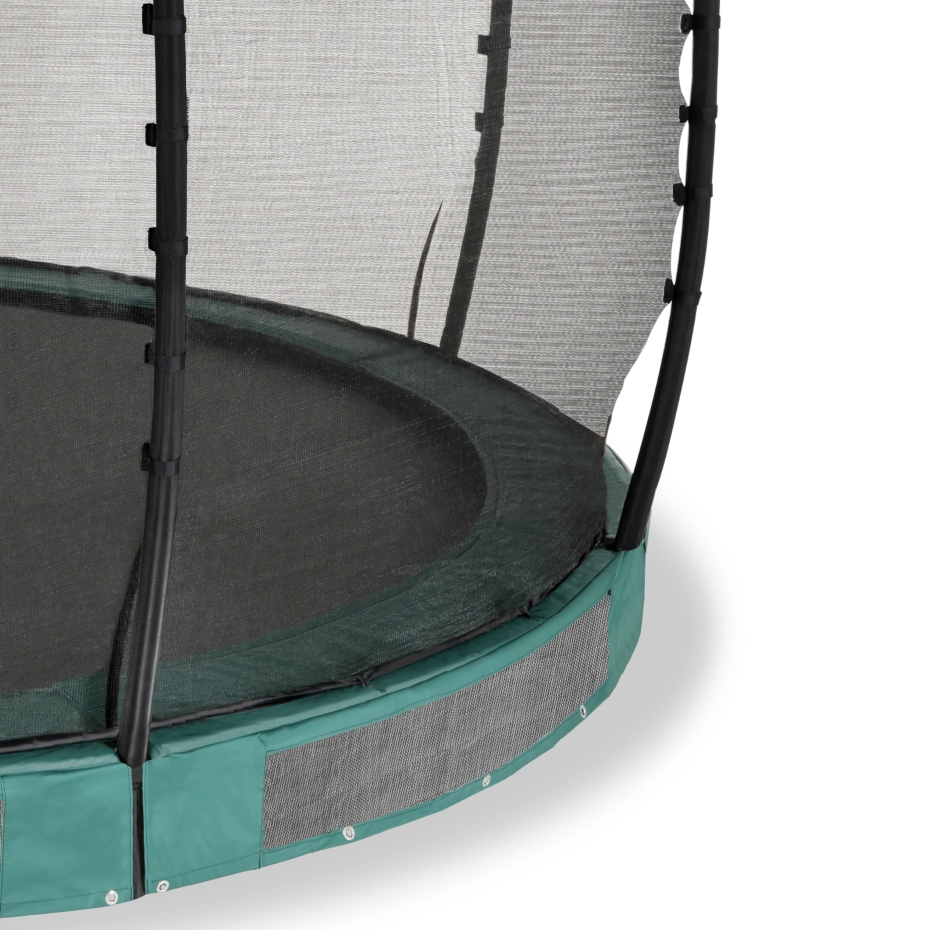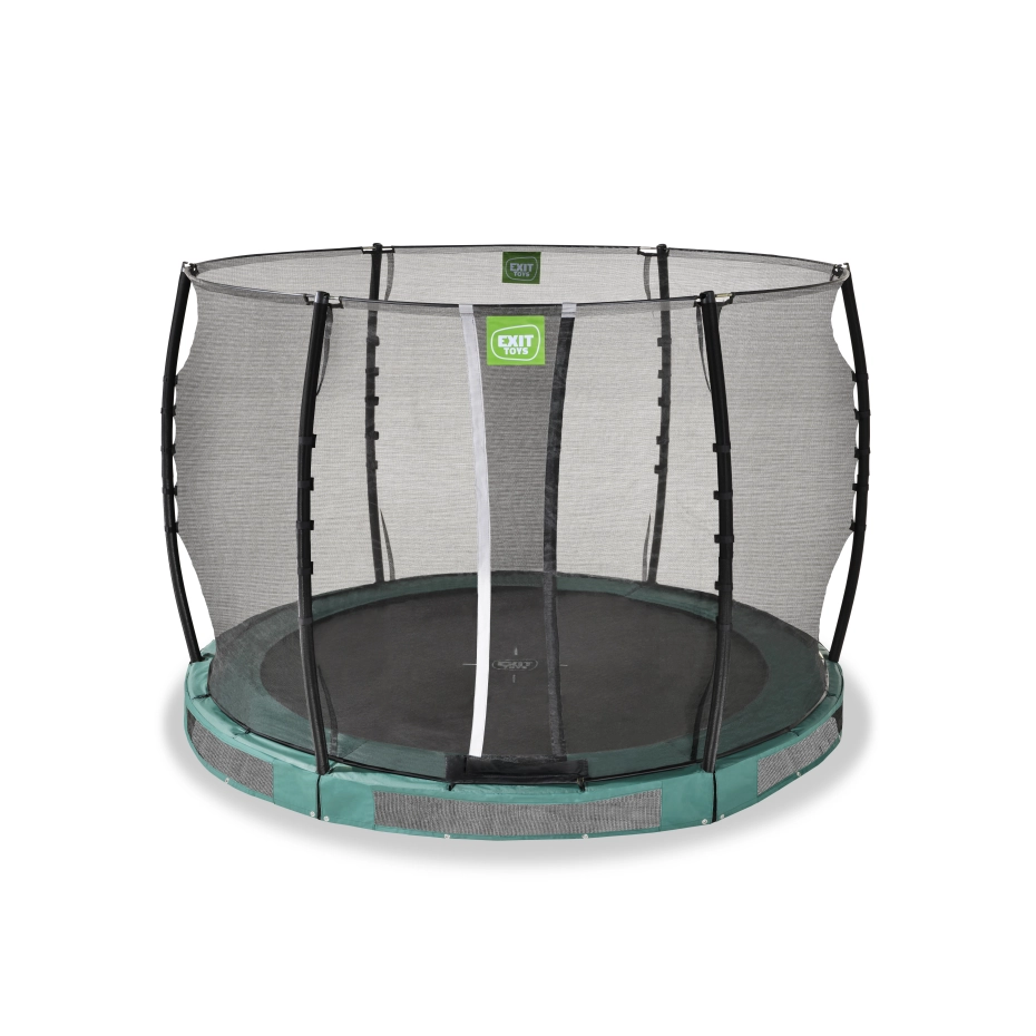 De EXIT Allure Classic inground trampoline is een ingraaftrampoline met een beschermrand en een veiligheidsnet. Dankzij het EXIT Foot Protection System (FPS), een net tussen het springdoek en de trampoline beschermrand, komen trampolinespringers nooit met hun voeten tussen de springveren. De Allure inground trampoline wordt gedeeltelijk ingegraven en is daardoor voor iedereen eenvoudig te betreden. Bovendien wordt de trampoline met een veiligheidsnet geleverd. Het veiligheidsnet heeft een overlappende ingang die automatisch sluit, zodat het nooit ongemerkt open blijft staan. Ook zijn de palen van het veiligheidsnet bedekt met schuim. Het trampolineframe is gegalvaniseerd en gepoedercoat en heeft daardoor een lange levensduur. Daarnaast is de beschermrand van deze trampoline voorzien van een beschermende, waterafstotende pvc-toplaag. Door middel van gebogen palen en een glasvezelring wordt het veiligheidsnet mooi strak in vorm gehouden. En last but not least: de Allure Classic ingraaftrampoline heeft dubbel conische veren die zorgen voor een soepele sprong en een zachte landing.