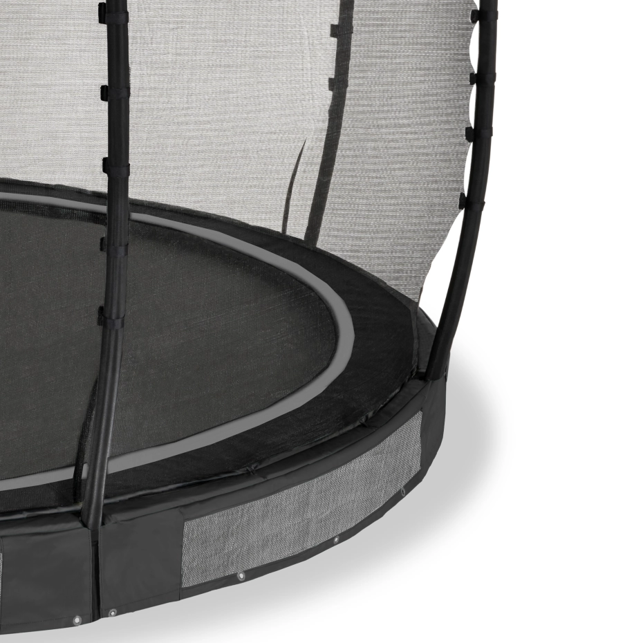 De EXIT Allure Classic inground trampoline is een ingraaftrampoline met een beschermrand en een veiligheidsnet. Dankzij het EXIT Foot Protection System (FPS), een net tussen het springdoek en de trampoline beschermrand, komen trampolinespringers nooit met hun voeten tussen de springveren. De Allure inground trampoline wordt gedeeltelijk ingegraven en is daardoor voor iedereen eenvoudig te betreden. Bovendien wordt de trampoline met een veiligheidsnet geleverd. Het veiligheidsnet heeft een overlappende ingang die automatisch sluit, zodat het nooit ongemerkt open blijft staan. Ook zijn de palen van het veiligheidsnet bedekt met schuim. Het trampolineframe is gegalvaniseerd en gepoedercoat en heeft daardoor een lange levensduur. Daarnaast is de beschermrand van deze trampoline voorzien van een beschermende, waterafstotende pvc-toplaag. Door middel van gebogen palen en een glasvezelring wordt het veiligheidsnet mooi strak in vorm gehouden. En last but not least: de Allure Classic ingraaftrampoline heeft dubbel conische veren die zorgen voor een soepele sprong en een zachte landing.