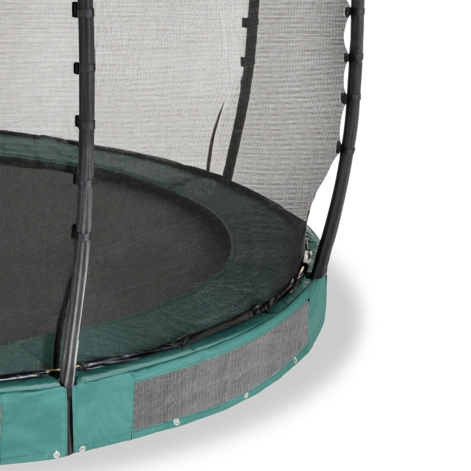 De EXIT Allure Premium inground trampoline is een ingraaftrampoline met een beschermrand en een Premium veiligheidsnet. Dankzij het EXIT Foot Protection System (FPS), een net tussen het springdoek en de trampoline beschermrand, komen trampolinespringers nooit met hun voeten tussen de springveren. De Allure inground trampoline wordt gedeeltelijk ingegraven en is daardoor voor iedereen eenvoudig te betreden. Bovendien wordt de trampoline met een Premium veiligheidsnet geleverd. Het veiligheidsnet heeft een overlappende ingang die automatisch sluit, zodat het nooit ongemerkt open blijft staan. Ook zijn de palen van het Premium veiligheidsnet bedekt met hoogwaardig XPE schuim. De extra lange dubbel conische veren van maar liefst 21,6 cm zorgen voor de perfecte sprong en een zachte landing. Op de EXIT Allure Premium ingraaftrampoline stijg je pas écht tot grote hoogte! Door het gegalvaniseerde en gepoedercoate frame heeft de trampoline een lange levensduur. Glasvezelringen en gebogen palen houden het veiligheidsnet super strak in vorm en de extra dikke beschermrand met waterafstotende pvc-toplaag beschermt jou én de trampoline optimaal.