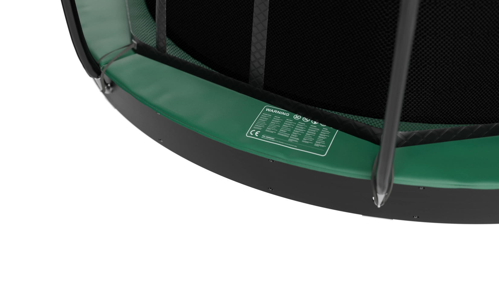 De groene beschermrand van de trampoline is op gelijke hoogte met de tuin zelf, waardoor hij bijna niet opvalt en het voor zelfs de aller kleinste makkelijk is er op en af te gaan.