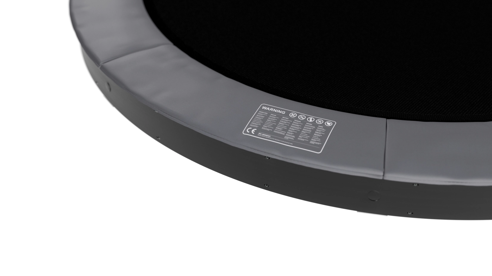 De grijze beschermrand van de trampoline is op gelijke hoogte met de tuin zelf, waardoor hij bijna niet opvalt en het voor zelfs de aller kleinste makkelijk is er op en af te gaan.