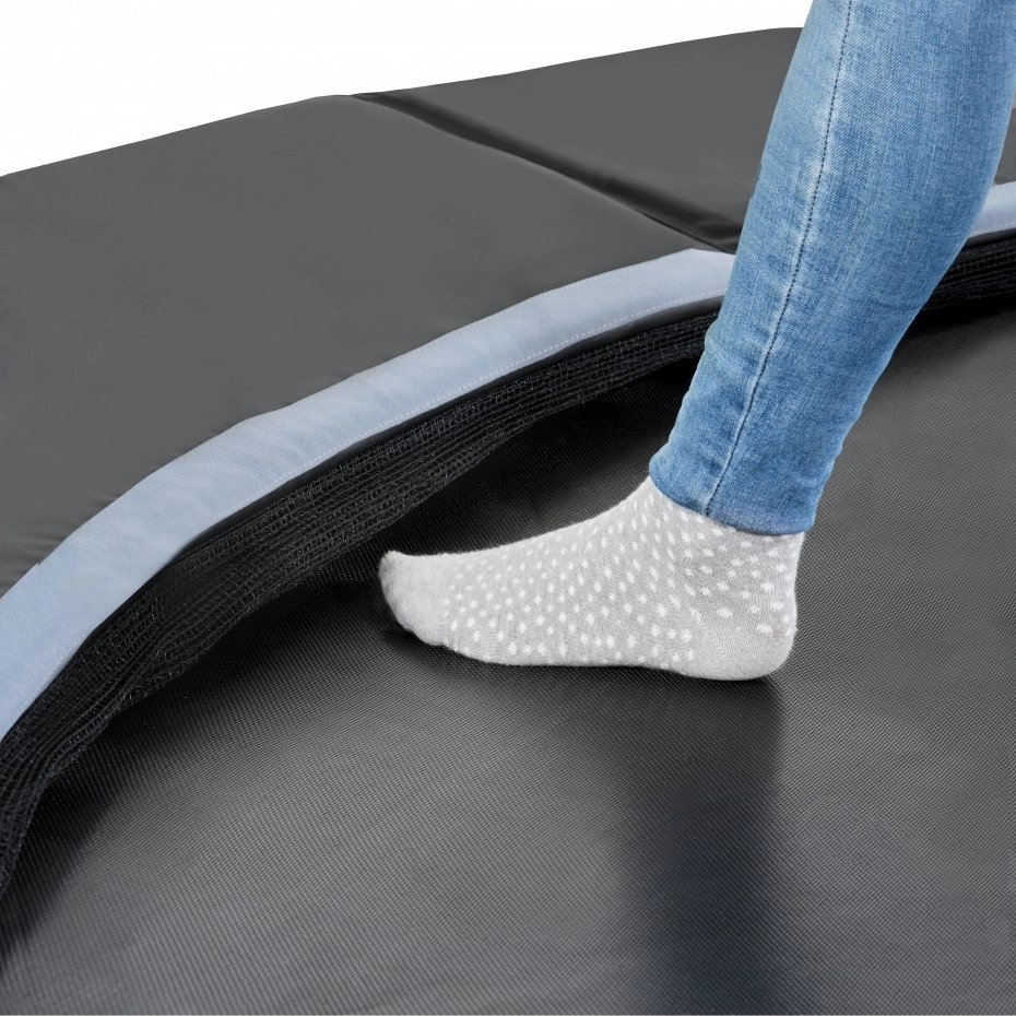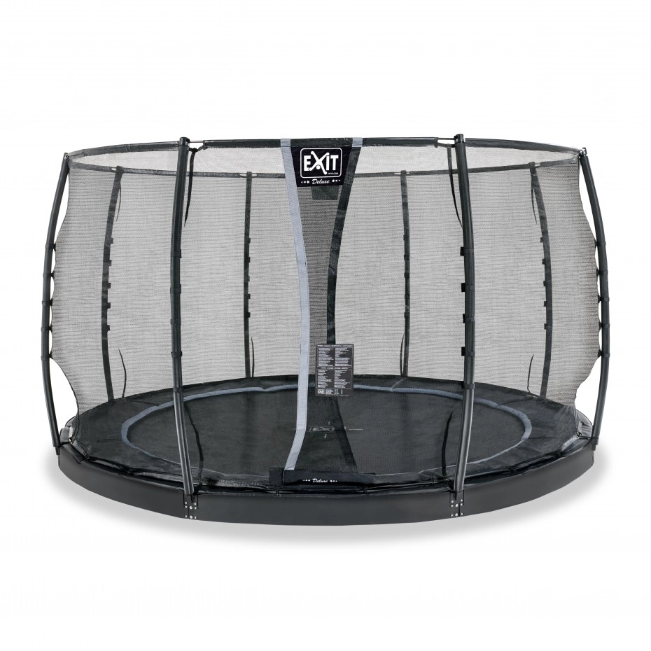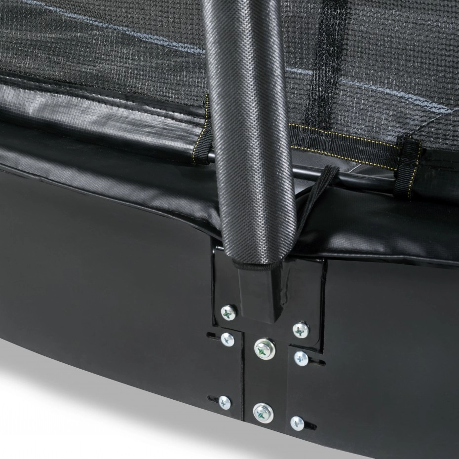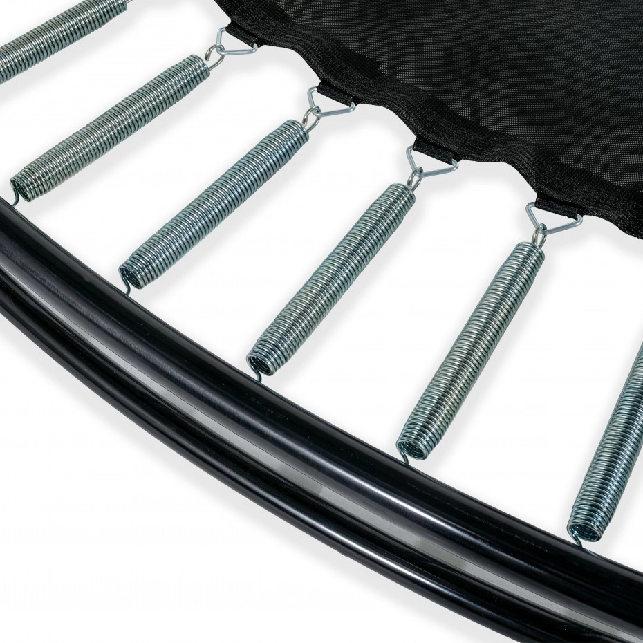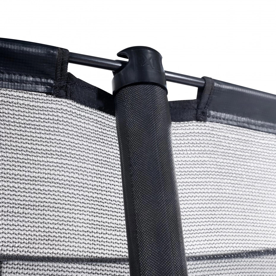 De trampoline EXIT Dynamic groundlevel is een ronde, matzwarte ingraaftrampoline van absolute topkwaliteit. Deze stevige trampoline wordt standaard geleverd met veiligheidsnet, zodat je zorgeloos kunt springen. Kinderen met veel springervaring tillen hun vaardigheden moeiteloos naar een nóg hoger level, want deze trampoline heeft dubbel conische veren van maar liefst 25cm lang. Toch blijft de trampoline bij de hoogste sprongen stevig op zijn plek, want het ultra stabiele frame is wel 42mm dik. Ook is het frame gegalvaniseerd en gepoedercoat voor een optimale bescherming tegen weersinvloeden en roest. De luxe matzwarte uitvoering en subtiele kleurdetails geven de trampoline een stijlvolle, moderne uitstraling. En het voordeel van een groundlevel trampoline is dat de beschermrand precies gelijkloopt met het gras, waardoor de trampoline volledig integreert met de rest van de tuin.