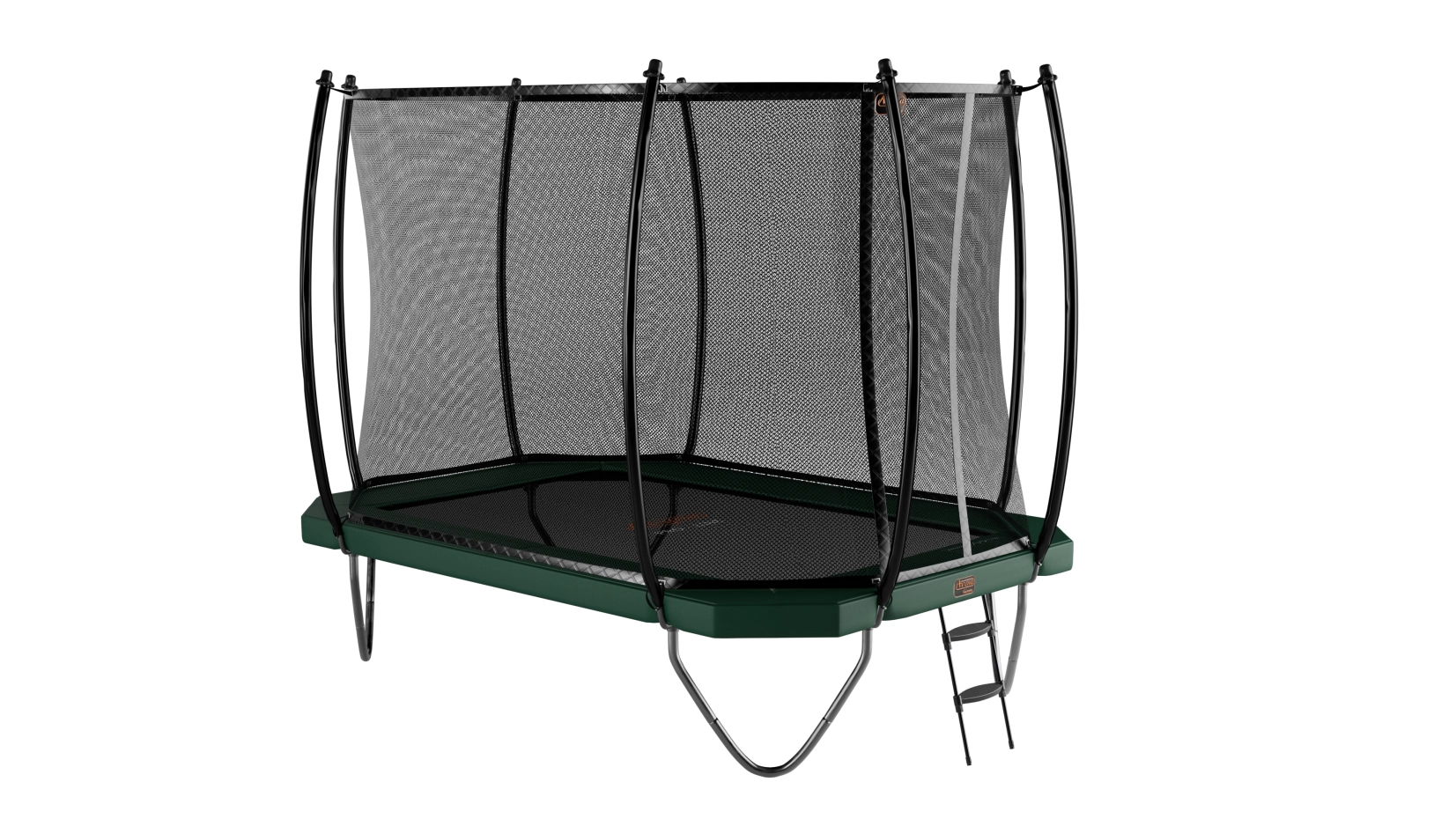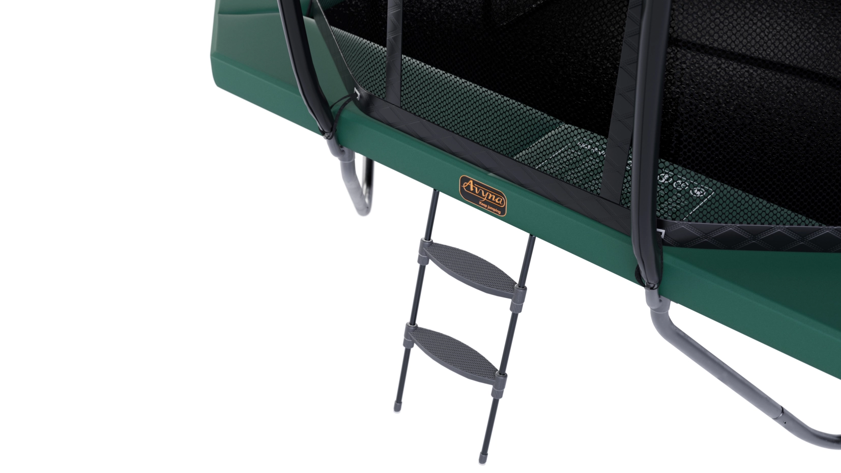 Een Avyna Pro-Line trampoline met een afmeting van 380x255 cm en een groene beschermrand. Deze trampoline wordt standaard als set geleverd met een veiligheidsnet en een trampolineladder.
