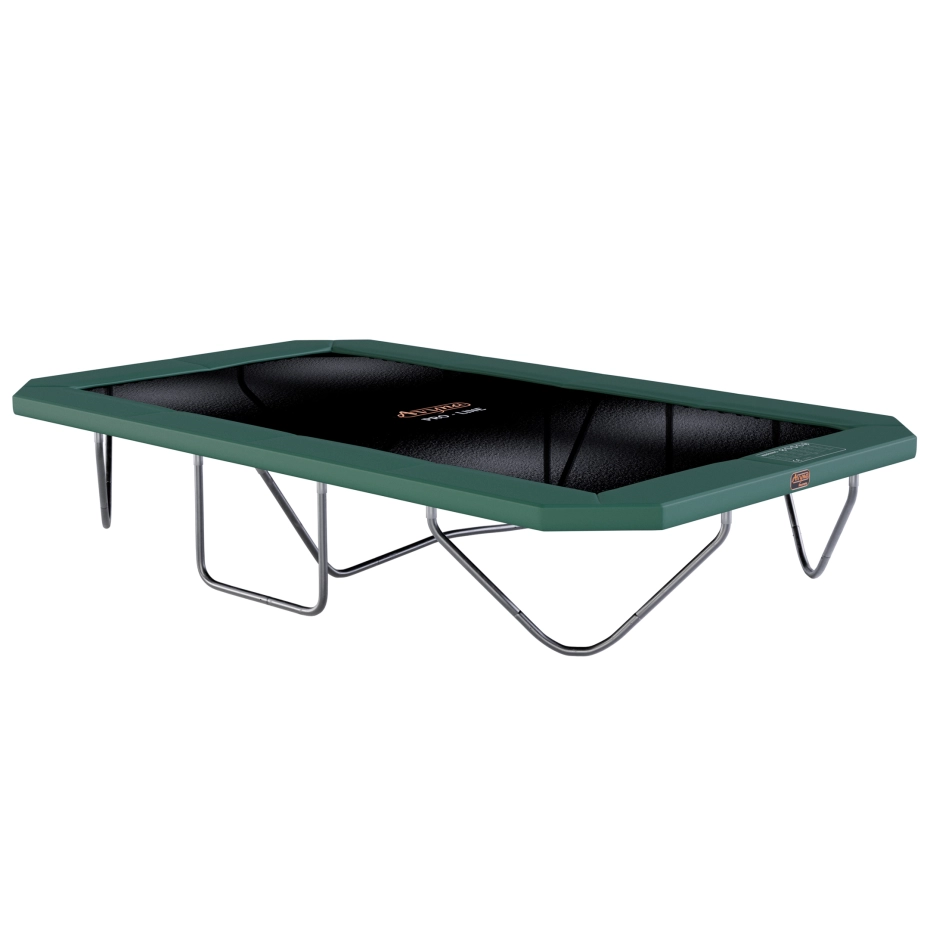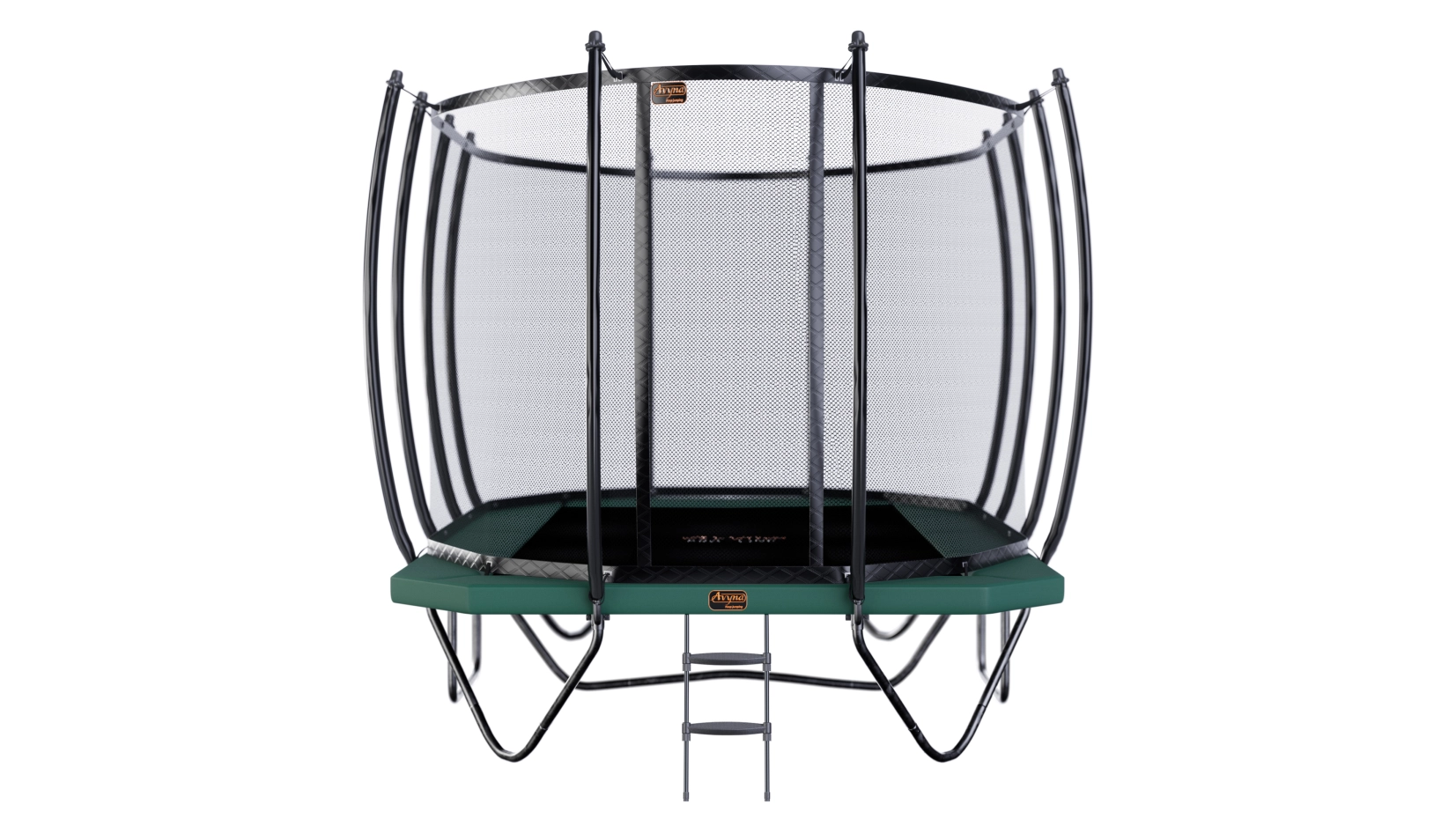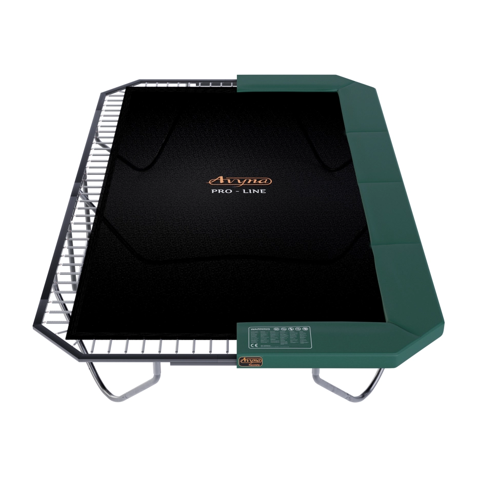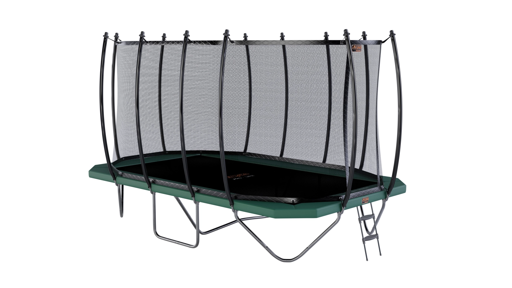 Een Avyna Pro-Line trampoline met een afmeting van 520x305cm en een groene beschermrand. Deze trampoline wordt standaard als set geleverd met een veiligheidsnet en een trampolineladder.