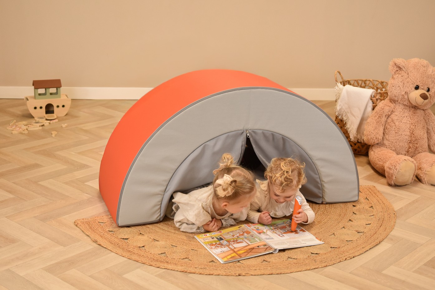 - De boog heeft extra stof met een rits in het midden, zodat je hem omgedraaid kunt gebruiken als gezellig tentje