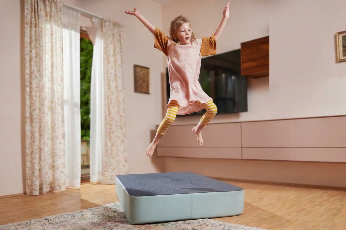 Met zijn formaat van 107×70×17 cm is er ruim voldoende plek om te spelen en te ontspannen. Binnenin zorgen de pocketveren voor veel vering, en het schuimstof maakt het kussen lekker zacht om op te springen. De hoes is wasbaar op 40°C (binnenstebuiten), waardoor het onderhoud eenvoudig blijft. Het speelkussen is geschikt voor een maximaal gebruikersgewicht van 40 kg en kan worden uitgebreid met een bijpassende rugleuning voor extra comfort.