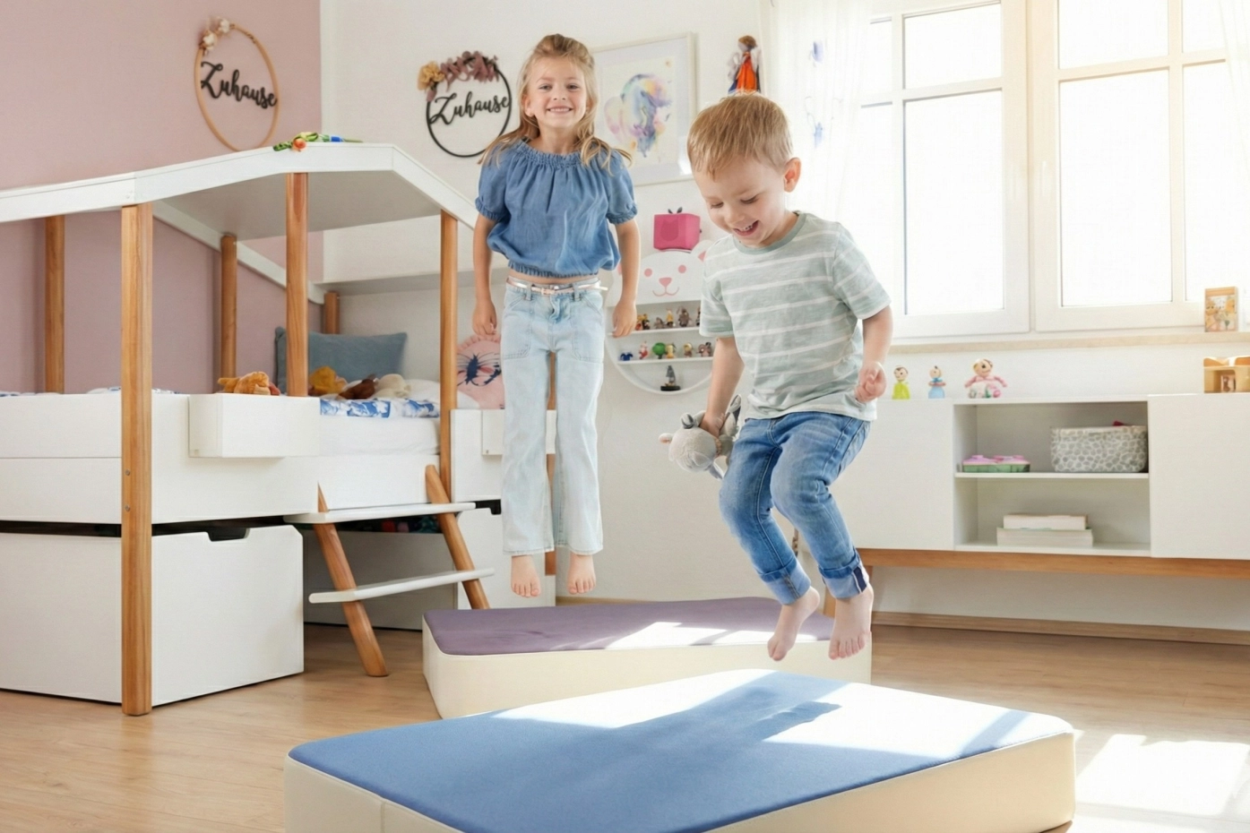 Met zijn formaat van 107×70×17 cm is er ruim voldoende plek om te spelen en te ontspannen. Binnenin zorgen de pocketveren voor veel vering, en het schuimstof maakt het kussen lekker zacht om op te springen. De hoes is wasbaar op 40°C (binnenstebuiten), waardoor het onderhoud eenvoudig blijft. Het speelkussen is geschikt voor een maximaal gebruikersgewicht van 40 kg en kan worden uitgebreid met een bijpassende rugleuning voor extra comfort.