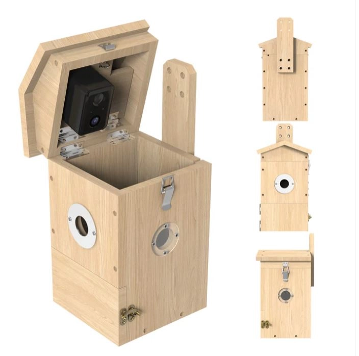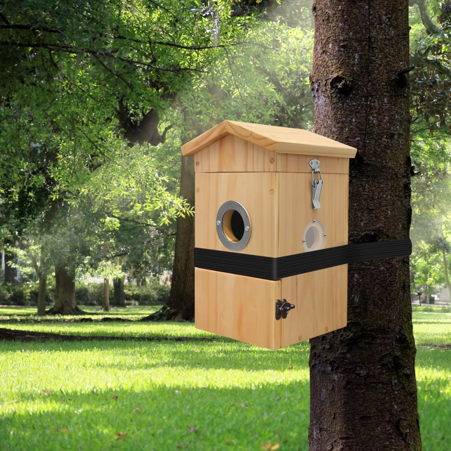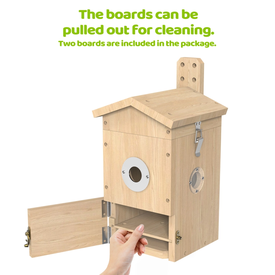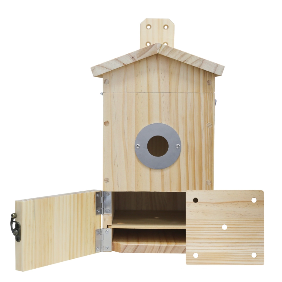 Volg de broedende vogels in je tuin! In het Sanilu vogelhuisje is er ruimte om een camera op te hangen. Zo kunt u het broedproces via uw telefoon volgen. De camera wordt opgeladen door het zonnepaneel. Zijn er te weinig zonne-uren? Laad het zonnepaneel dan op met de meegeleverde kabel. Het vogelhuisje heeft een vlieggat van 3,2cm, welke is voorzien van een aluminium anti-pikstrip. De zijkant van het vogelhuisje is voorzien van een klein raampje, waardoor er voldoende licht in uw huisje valt. Door het speciale plateau vanbinnen, worden de camera en de kabels uit de buurt van de vogels gehouden. De uitneembare bodem is makkelijk schoon te maken. Er wordt zelfs een extra bodem meegeleverd.