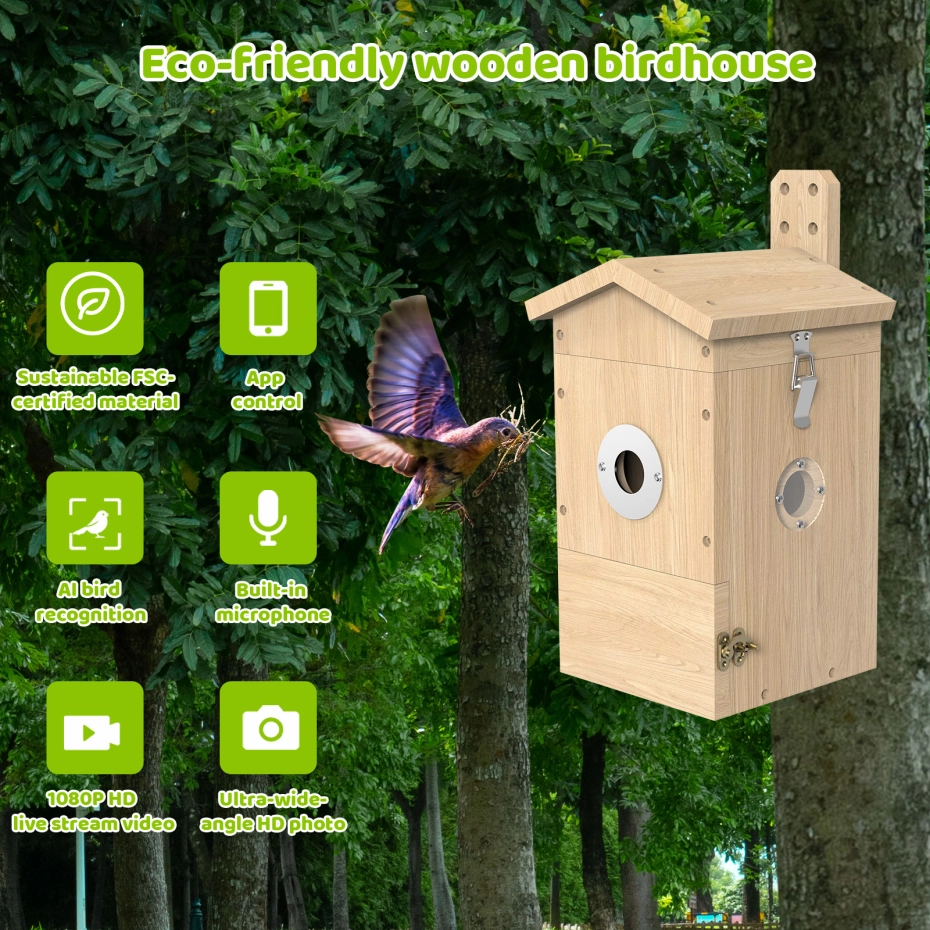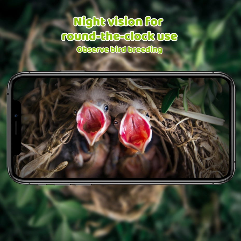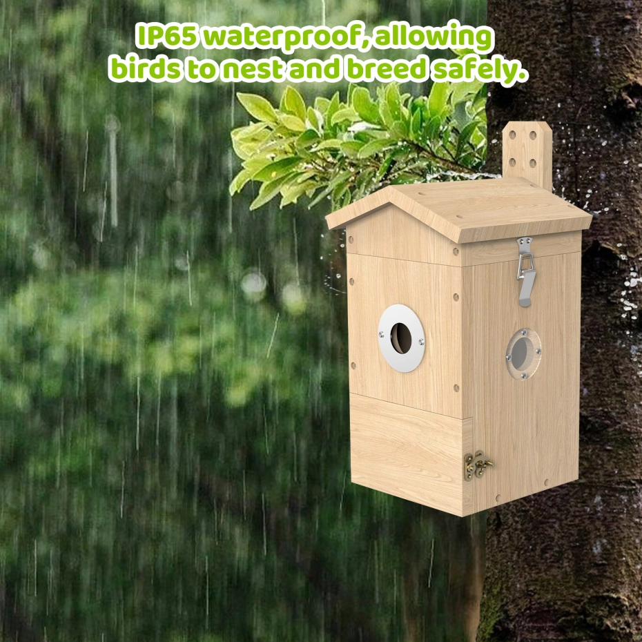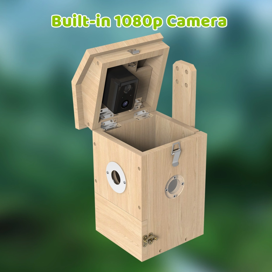 Volg de broedende vogels in je tuin! In het Sanilu vogelhuisje is er ruimte om een camera op te hangen. Zo kunt u het broedproces via uw telefoon volgen. De camera wordt opgeladen door het zonnepaneel. Zijn er te weinig zonne-uren? Laad het zonnepaneel dan op met de meegeleverde kabel. Het vogelhuisje heeft een vlieggat van 3,2cm, welke is voorzien van een aluminium anti-pikstrip. De zijkant van het vogelhuisje is voorzien van een klein raampje, waardoor er voldoende licht in uw huisje valt. Door het speciale plateau vanbinnen, worden de camera en de kabels uit de buurt van de vogels gehouden. De uitneembare bodem is makkelijk schoon te maken. Er wordt zelfs een extra bodem meegeleverd.