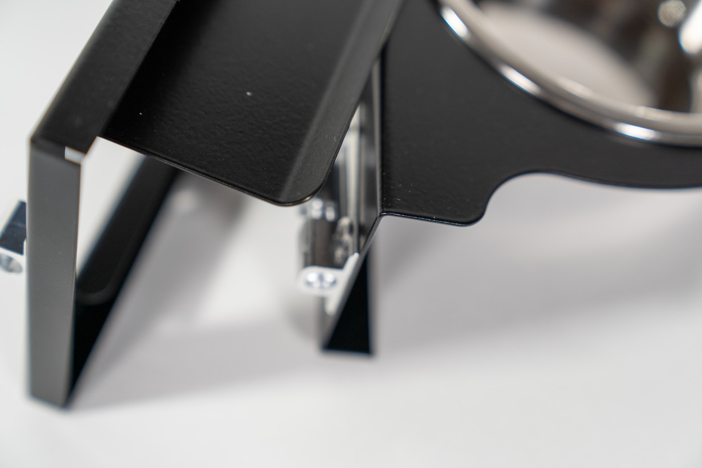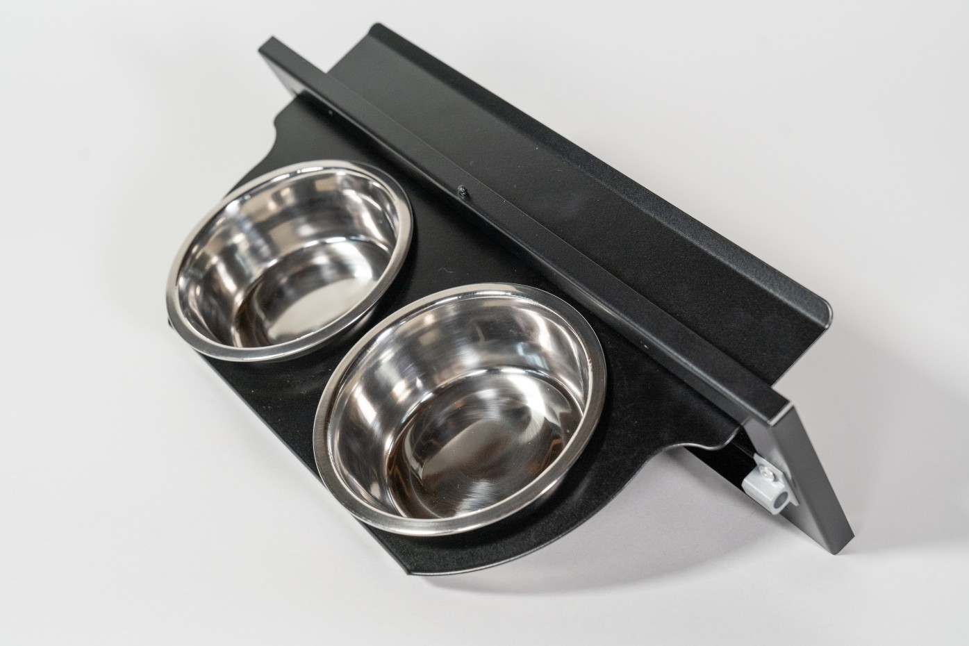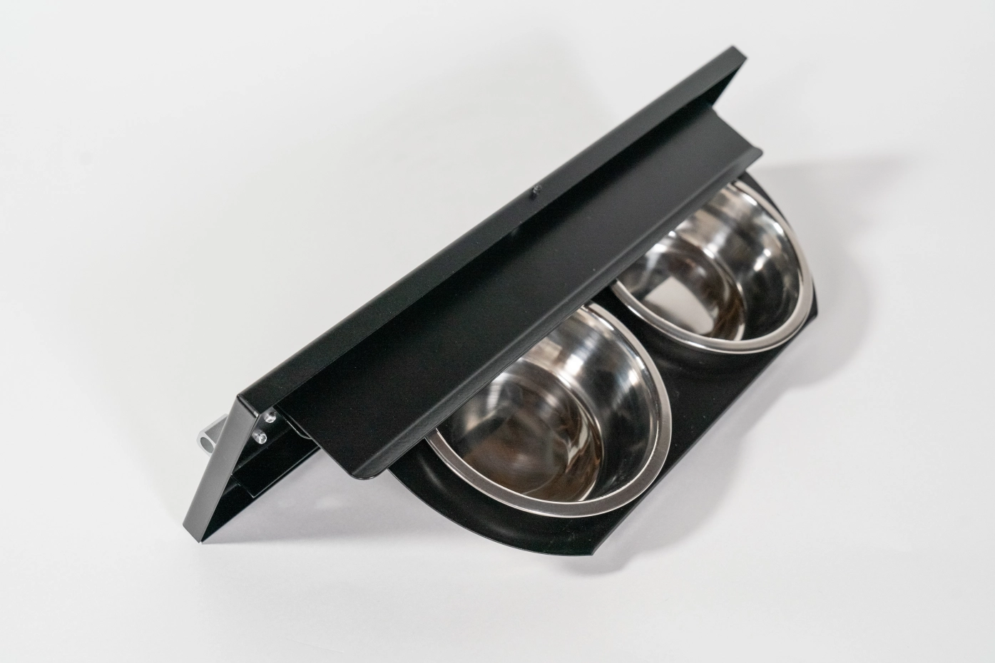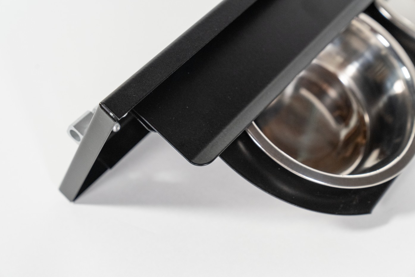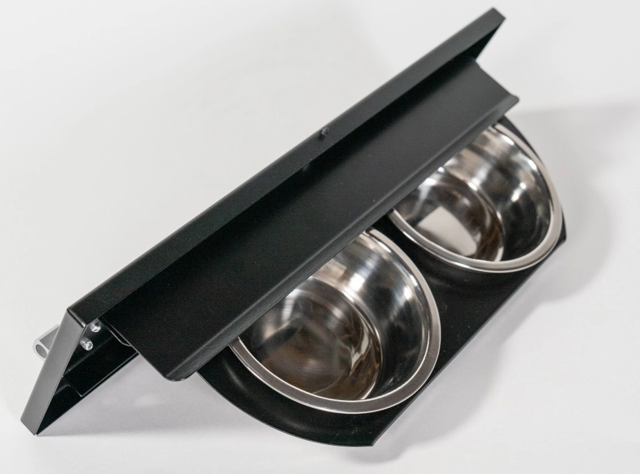 Draaibaar voederplateau voor in de volière. Dit stevige draaibare voederplateau is eenvoudig te monteren in de volière. Het voederplateau is verzinkt en daarna zwart gepoedercoat. Het voederplateau beschikt over 2 RVS kommen. De kommen van hebben een doorsnede van 13cm.