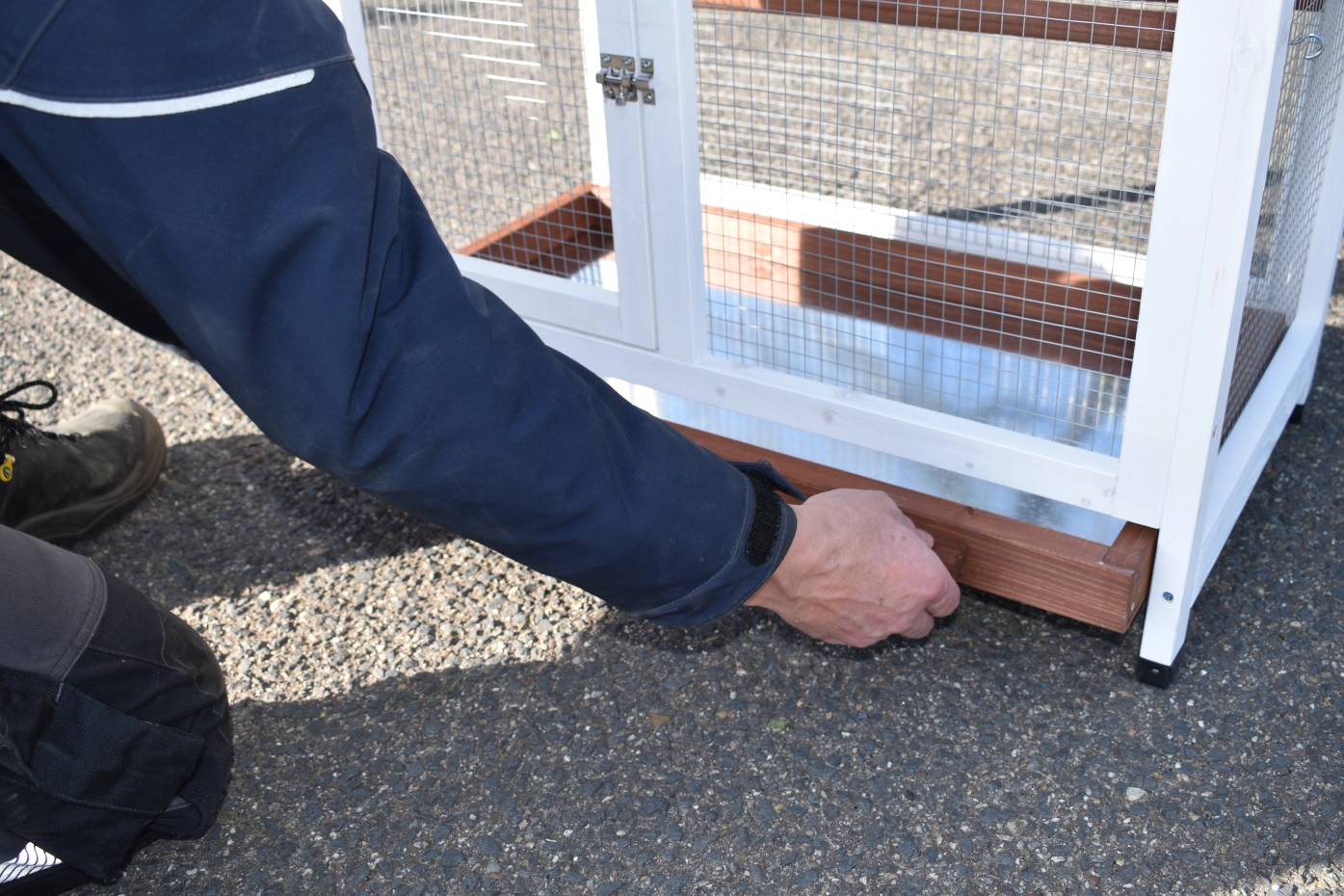 Let op: Als de schuiflade eruitgehaald wordt, heeft het hok geen bodem meer.