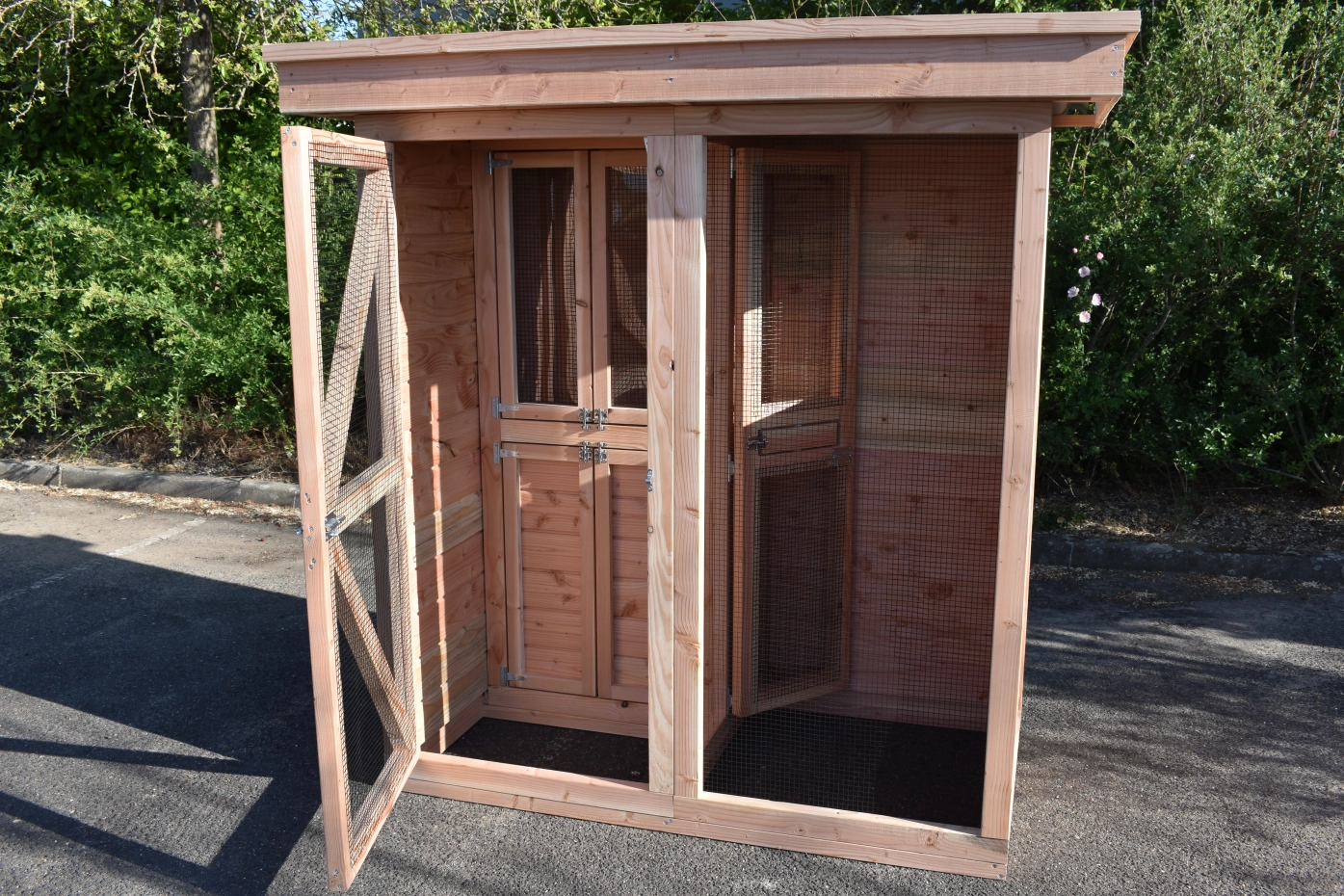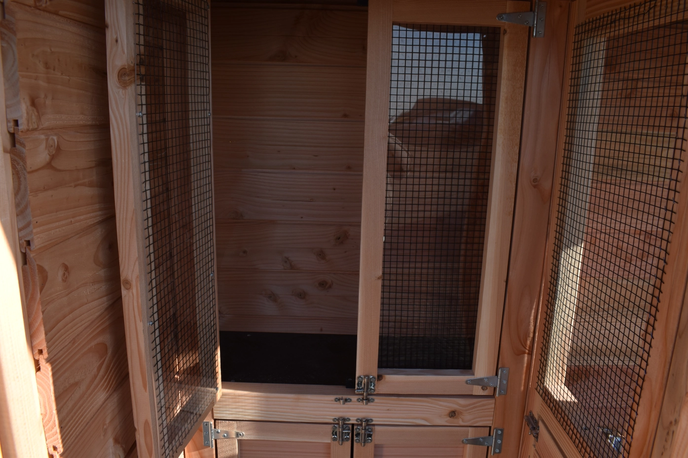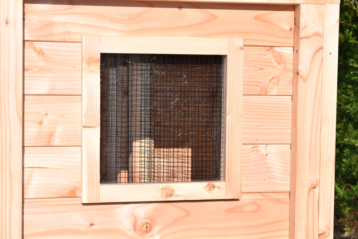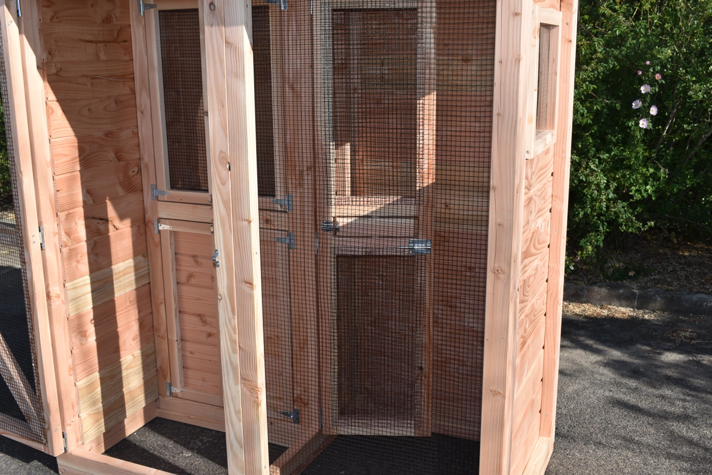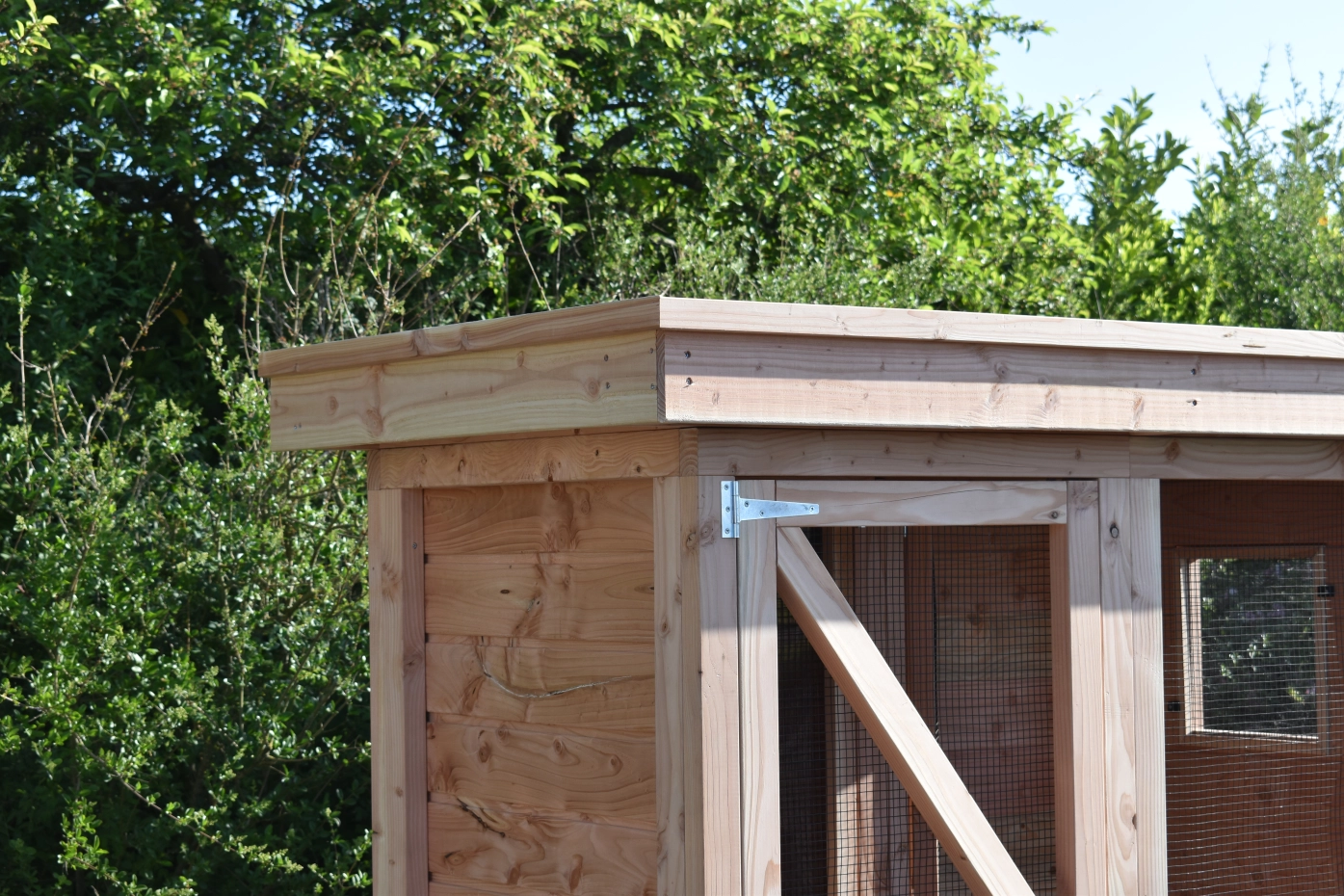 - De wanden zijn helemaal kant en klaar. Planken zitten erop gespijkerd, deuren zijn afgehangen en voorzien van sloten, gaas is erop gespannen, enz. Hierdoor is de montage heel eenvoudig!