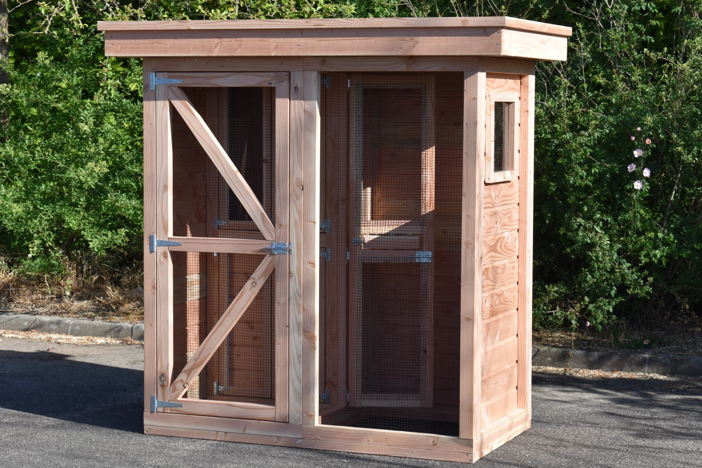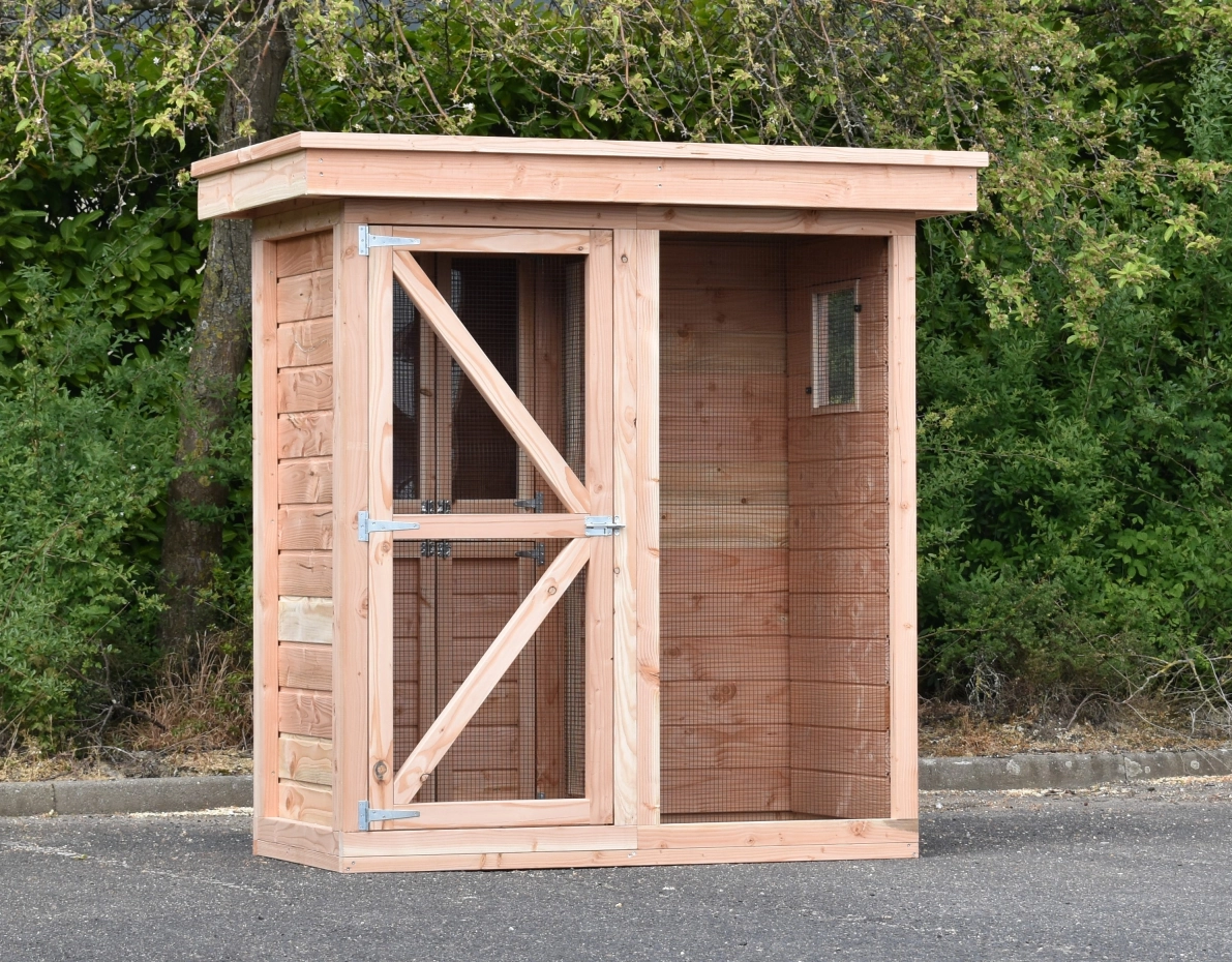 Volière Flex 2.1 luxe is een kleine volière voor buiten, speciaal ontworpen voor kleine tuinen, maar toch mooi afgewerkt. Omdat de volière voorzien is van een sluisje kunnen de vogels niet ontsnappen. Het nachthok bestaat uit twee deurtjes, ook het opberghok onder het nachthok bestaat uit twee deurtjes. Door de ronde opening van het nachthok naar de ren, kunnen de vogeltjes vrij uit en in vliegen. Deze opening is afsluitbaar door middel van een schuifje. De volière heeft een luxe afgewerkt dak van golfplaten. Zitstokken zijn eventueel los mee te bestellen.