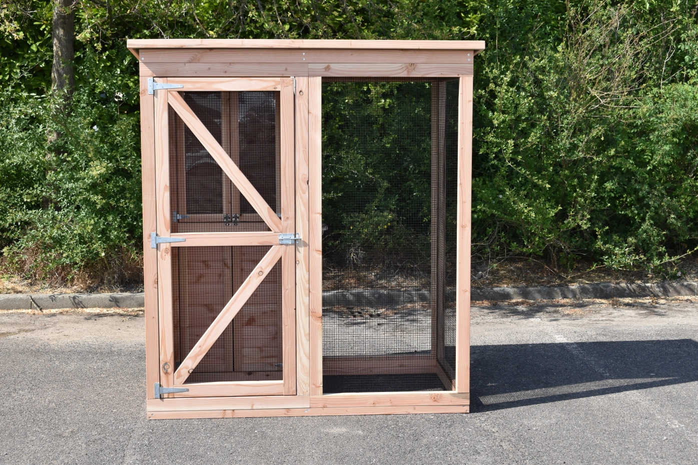 Volière Flex 2.1 is een kleine volière voor buiten, speciaal ontworpen voor kleine tuinen, maar toch van alle benodigdheden voorzien. Zo is deze volière voorzien van een sluisje, zodat u bij de vogels kunt zonder dat ze kunnen ontsnappen. Het nachthok is voorzien van 2 deuren. De ronde opening van het nachthok naar de vlucht (ren) is afsluitbaar door middel van een schuifje. De volière heeft een opberghok met twee deurtje en een betonplex dak. De zitstokken kunt u los mee bestellen.