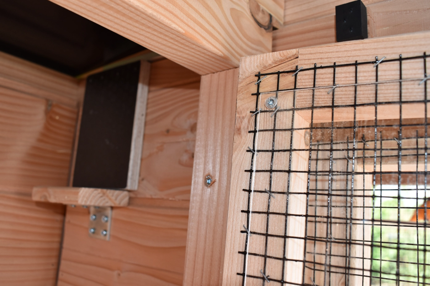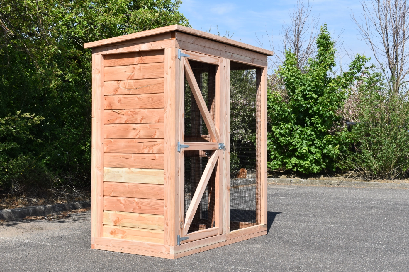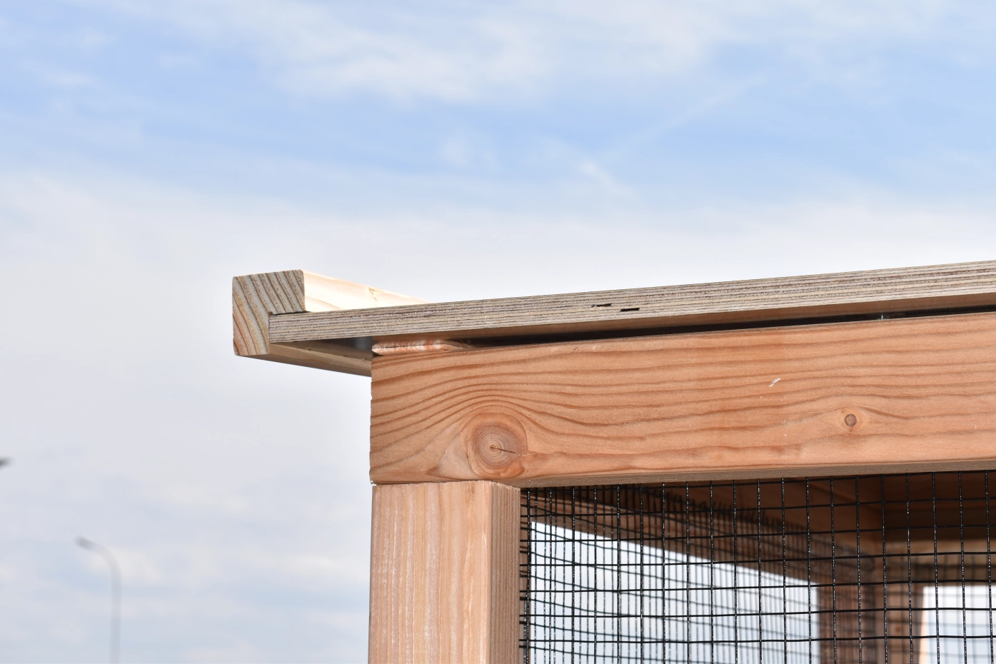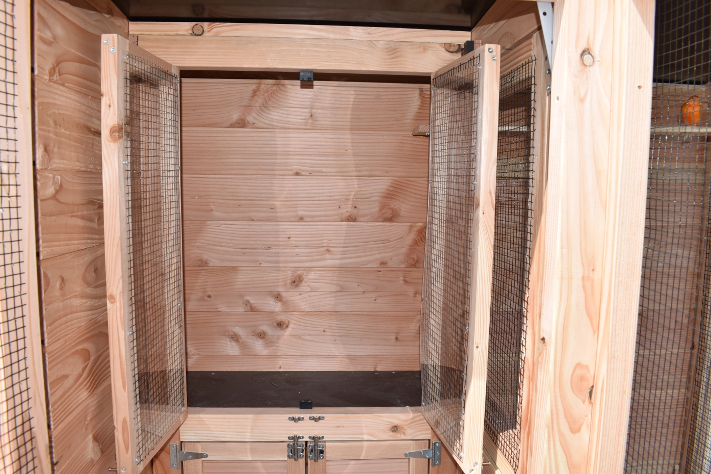 - De wanden zijn helemaal kant en klaar. Planken zitten erop gespijkerd, deuren zijn afgehangen en voorzien van sloten, gaas is erop gespannen, enz. Hierdoor is de montage heel eenvoudig!
