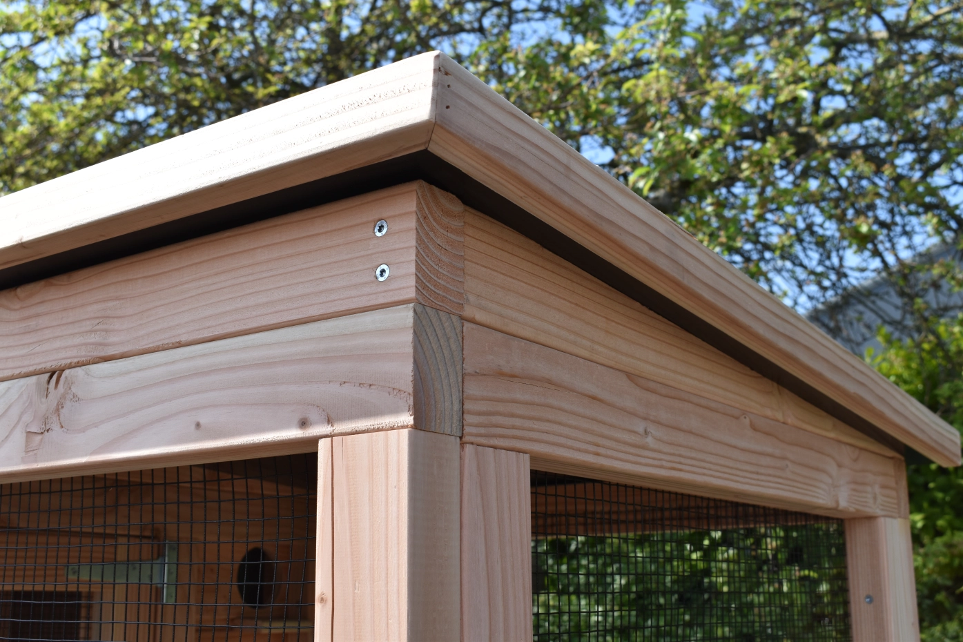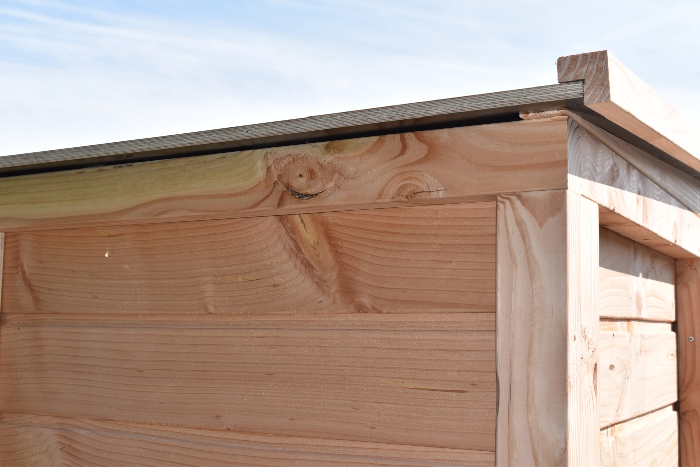 - Bij dit hok wordt een fundering meegeleverd van 4,5 cm hoog. Hierop worden de panelen vast geschroefd. Wij raden aan om een stevige en vlakke ondergrond te voorzien met bijvoorbeeld tegels of opsluitbanden.