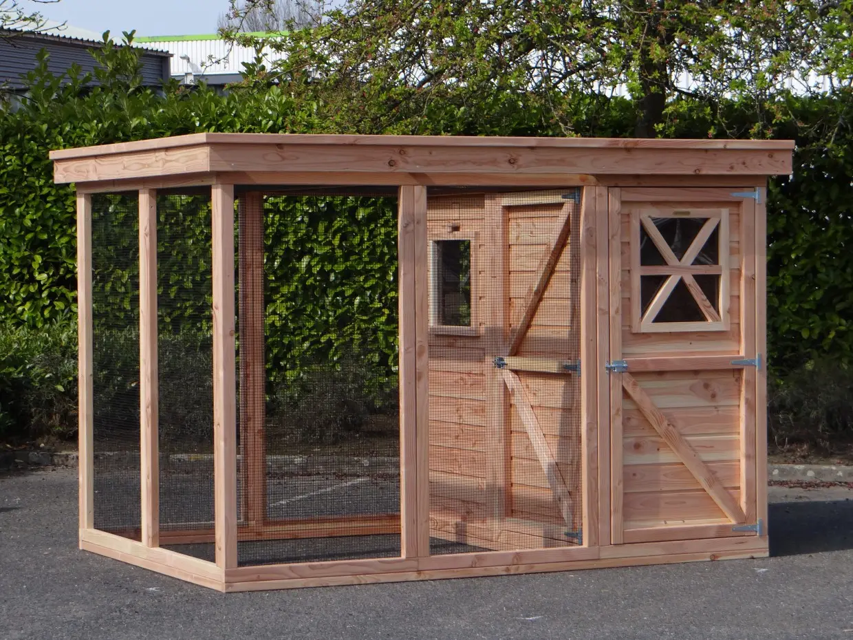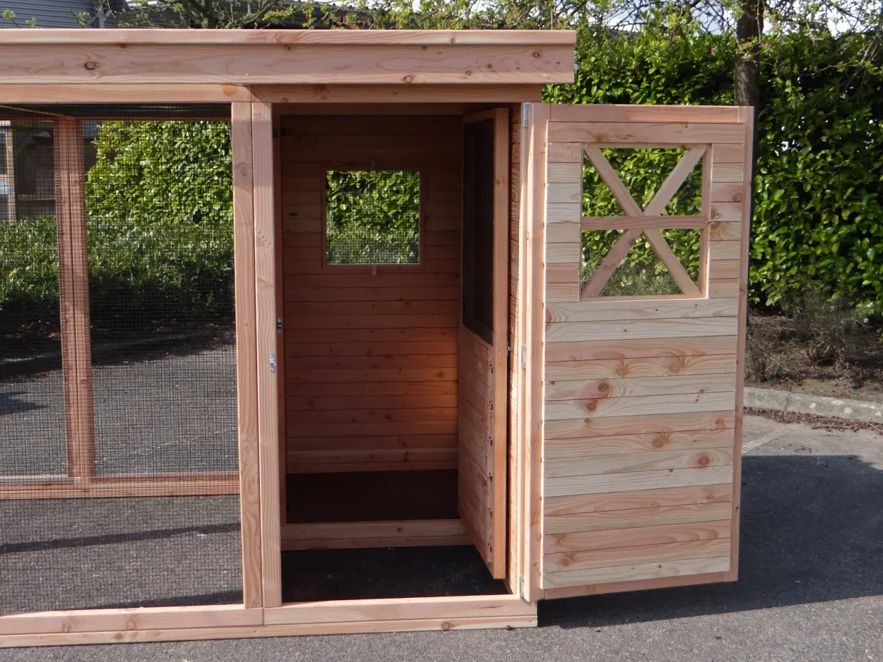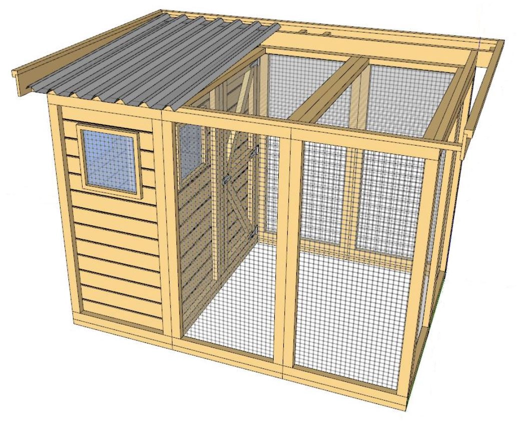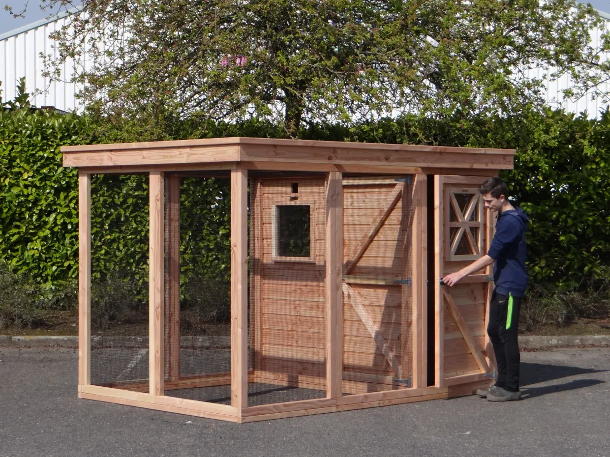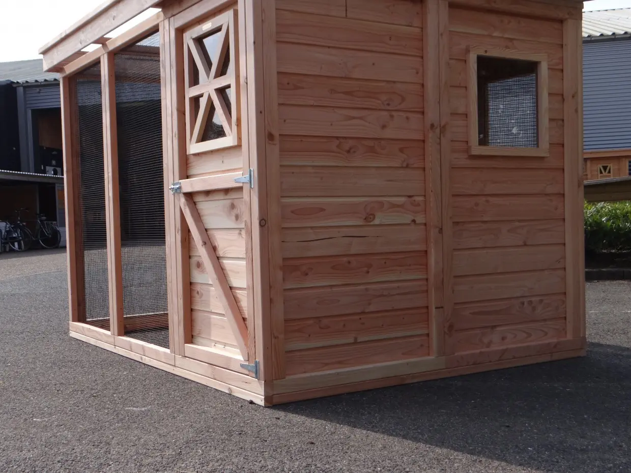- Het hok wordt als bouwpakket geleverd met compleet voorgemonteerde wanden. Deze wanden zijn eenvoudig aan elkaar te schroeven. Boortje, schroeven en bitjes worden meegeleverd.