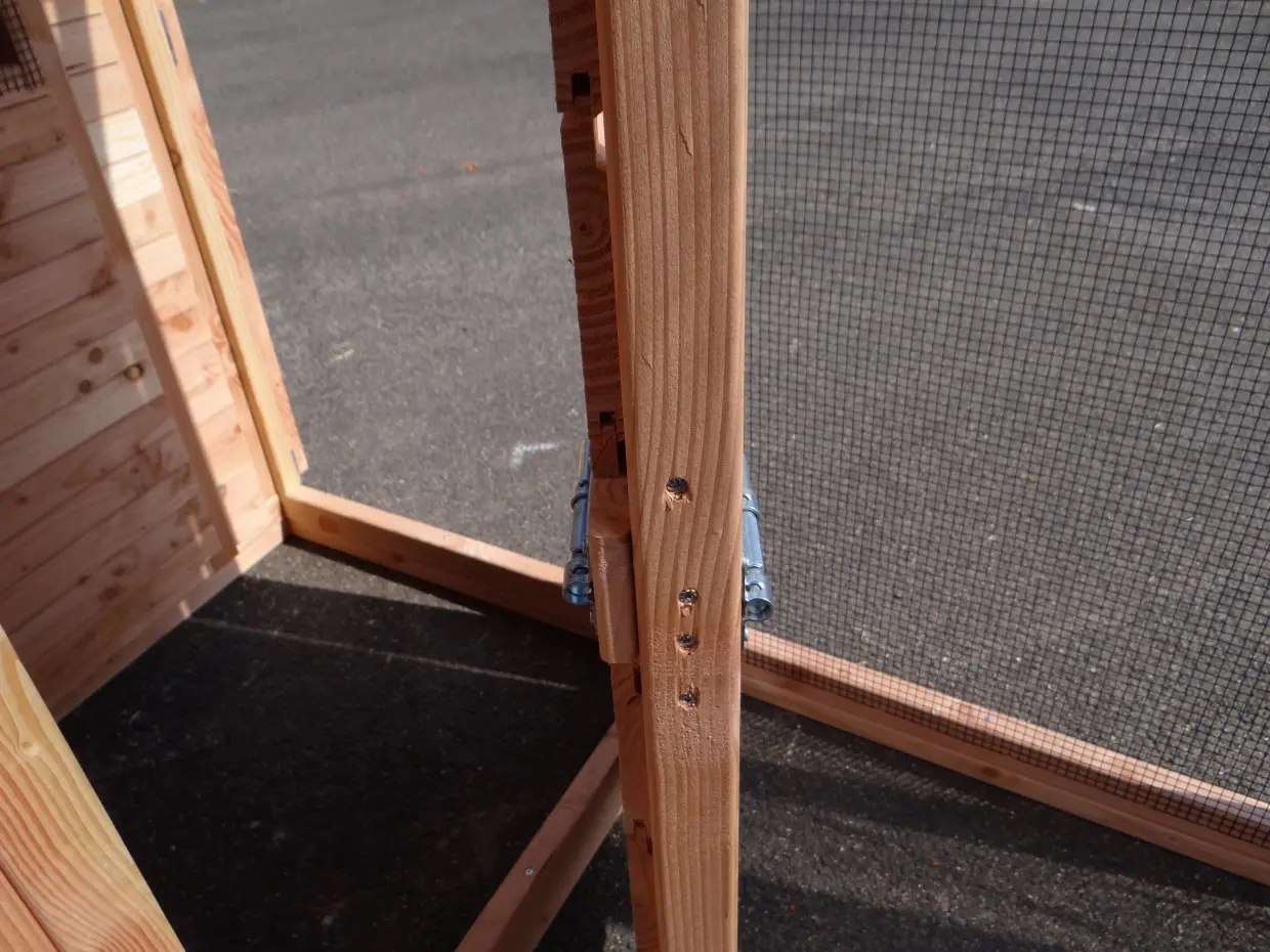 - De wanden zijn helemaal kant en klaar. Planken zitten erop gespijkerd, deuren zijn afgehangen en voorzien van sloten, gaas is erop gespannen, enz. Hierdoor is de montage heel eenvoudig!