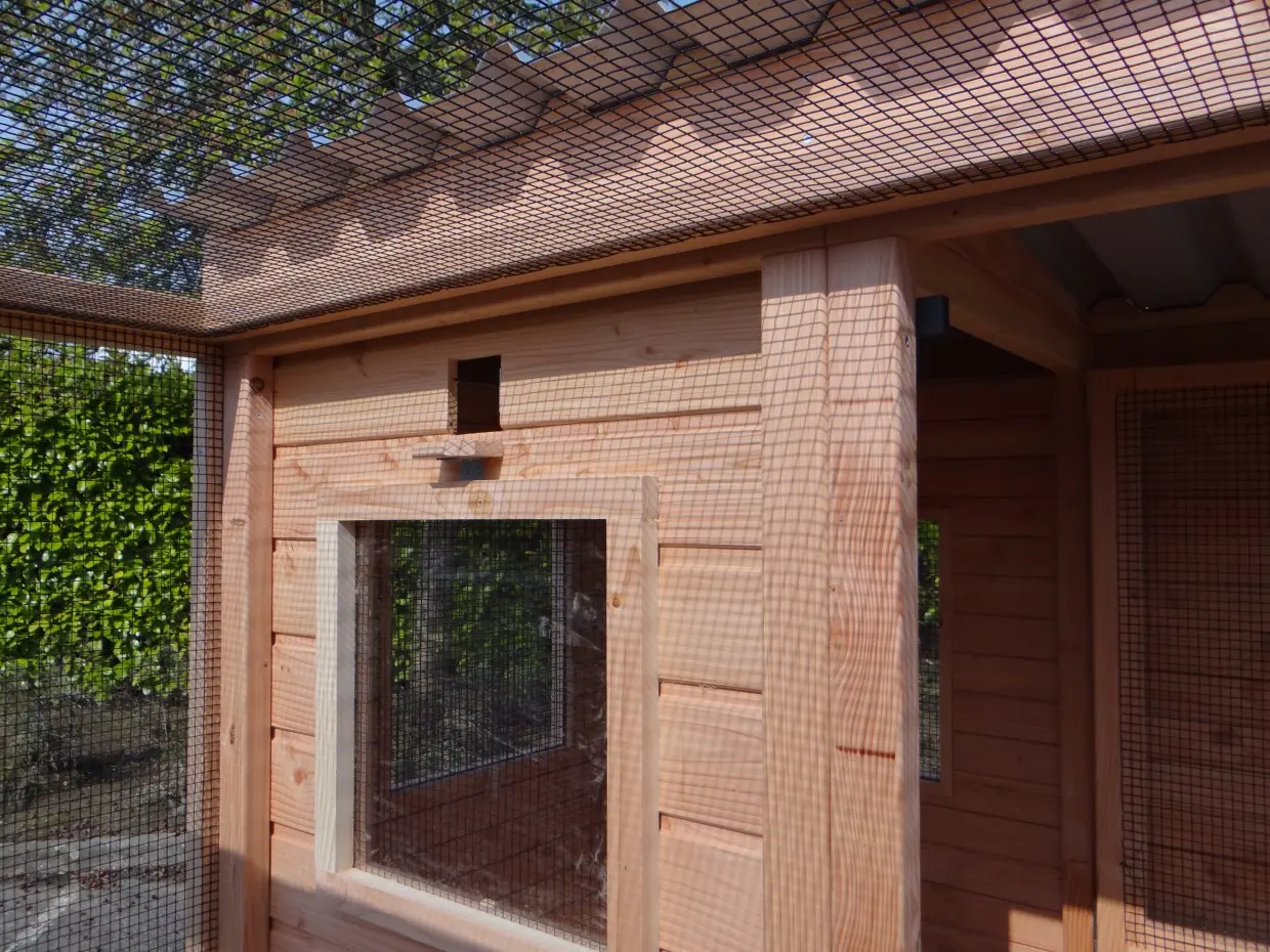 Let op! De dakplaat van staal aluzink boven het nachthok loopt naar achter toe af.