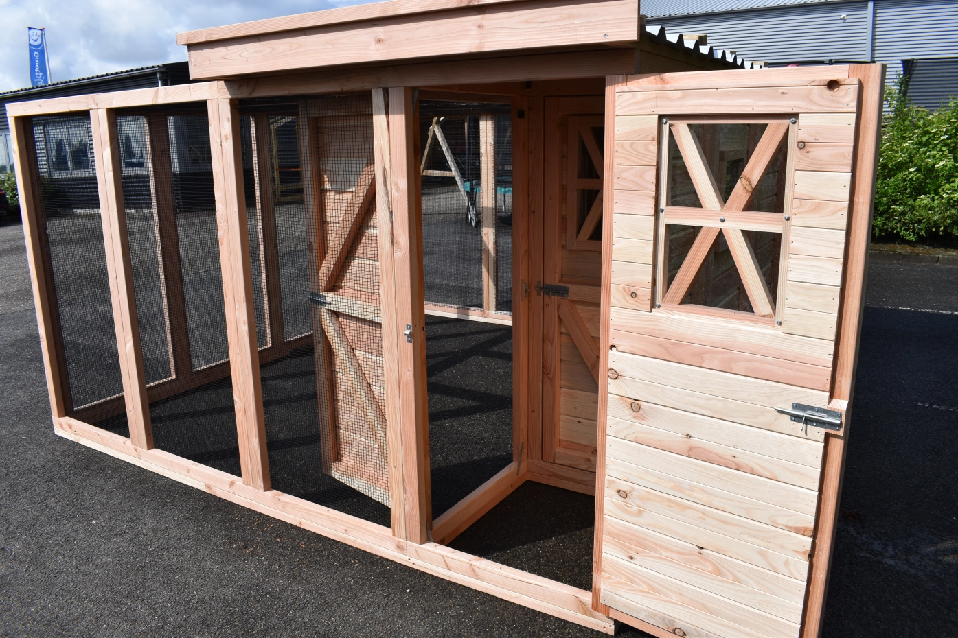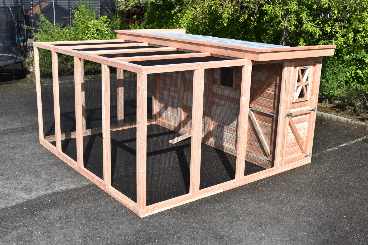 Volière / kwartelhok Flex 4.4 is een ruime vogelkooi met een groot nachthok met diverse openingen: 2 voor vogels en 1 voor kwartels. Via de sluis kunt u makkelijk in de kooi komen zonder dat de vogels of kwartels kunnen ontsnappen. Vanuit de sluis kunt u naar de vlucht of naar het nachthok. Het nachthok is voorzien van meerdere raampjes zodat er voldoende lichtinval is. De raampjes zijn voorzien van plexiglas en uitneembare gaaspaneeltjes. De houten deur vanaf de sluis naar de ren kan aan beide zijden afgesloten worden. In de ruime vlucht of ren van ca. 340x250cm hebben vogels en kwartels lekker de ruimte. De ren is grotendeels voorzien van een gaasdak, en deels overdekt. Het nachthok en de sluis hebben een dicht dak met luxe afwerking.
