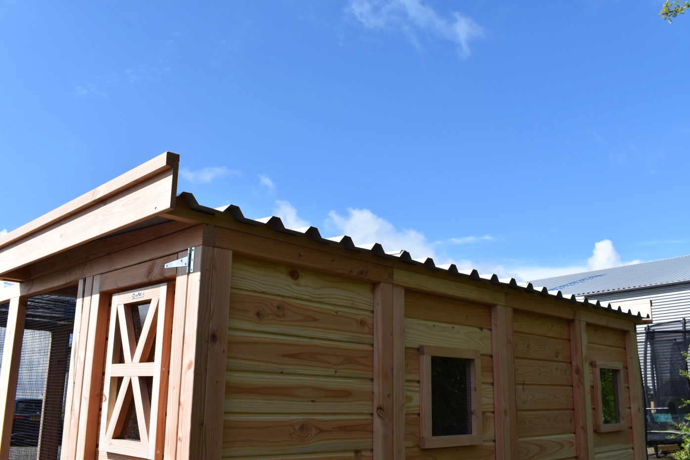 - Het hok wordt als bouwpakket geleverd met compleet voorgemonteerde wanden. Deze wanden zijn eenvoudig aan elkaar te schroeven. Boortje, schroeven en bitjes worden meegeleverd.