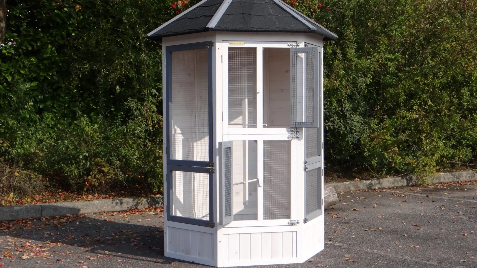 - Deze volière is gemaakt van mooi dennenhout