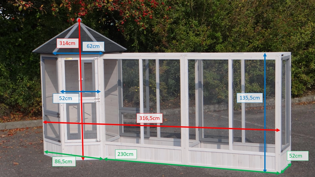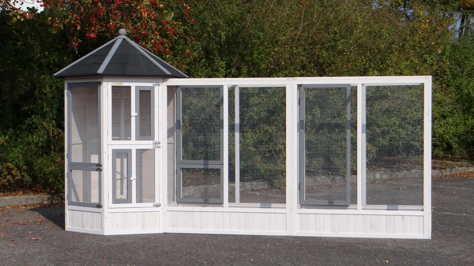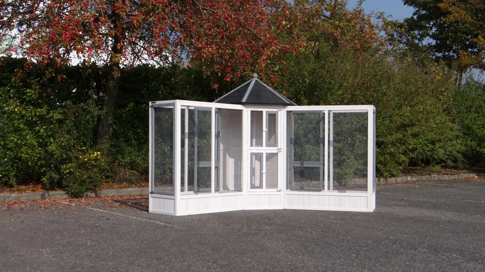 Volière Hannah is een pracht vogelkooi. Een luxe, zeer mooie voliere waarin diverse soorten tropische vogels of kanaries gehuisvest kunnen worden. Een prachtige combinatie van volière en 2 aanbouwren. Deze mooie volière is voorzien van veel grote en kleine deurtjes, heeft twee nestkasten en vijf zitstokken. Deze combinatie kan onbeperkt worden uitgebouwd met de aanbouwren Hannah.