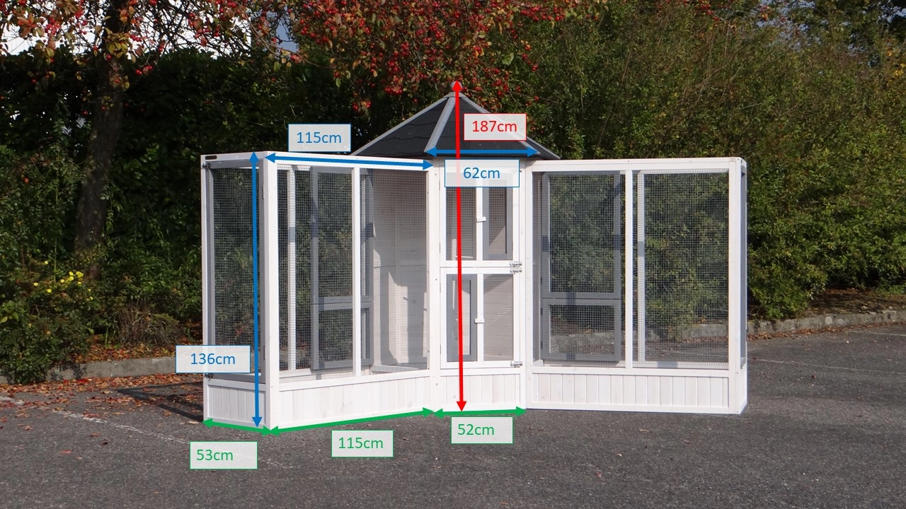 | Buitenwerkse afmetingen incl. dak (DxH) | Volière: 120x187cm |