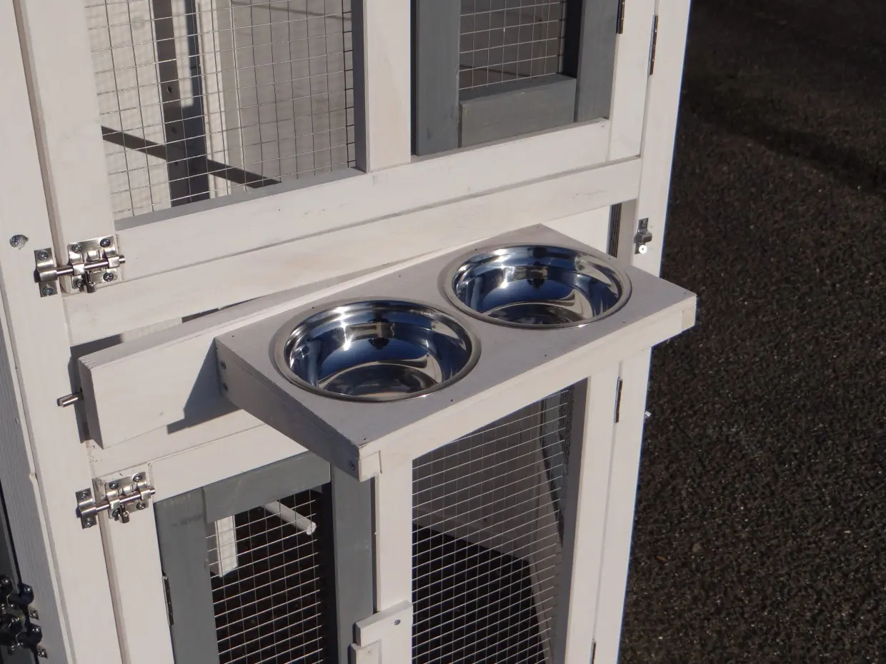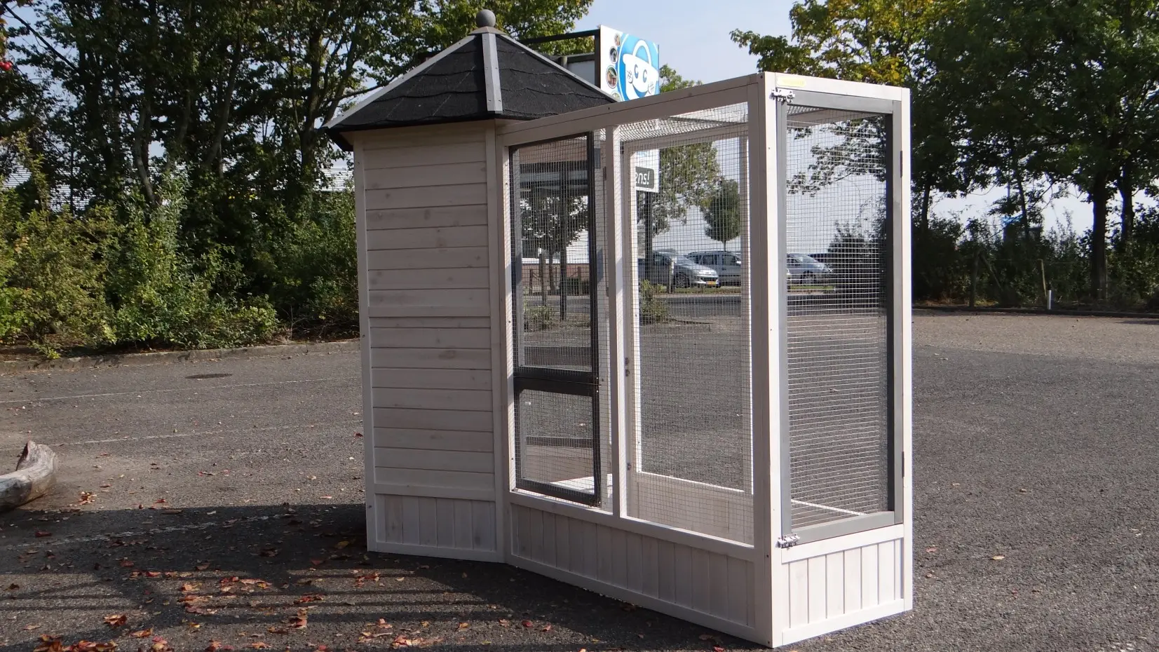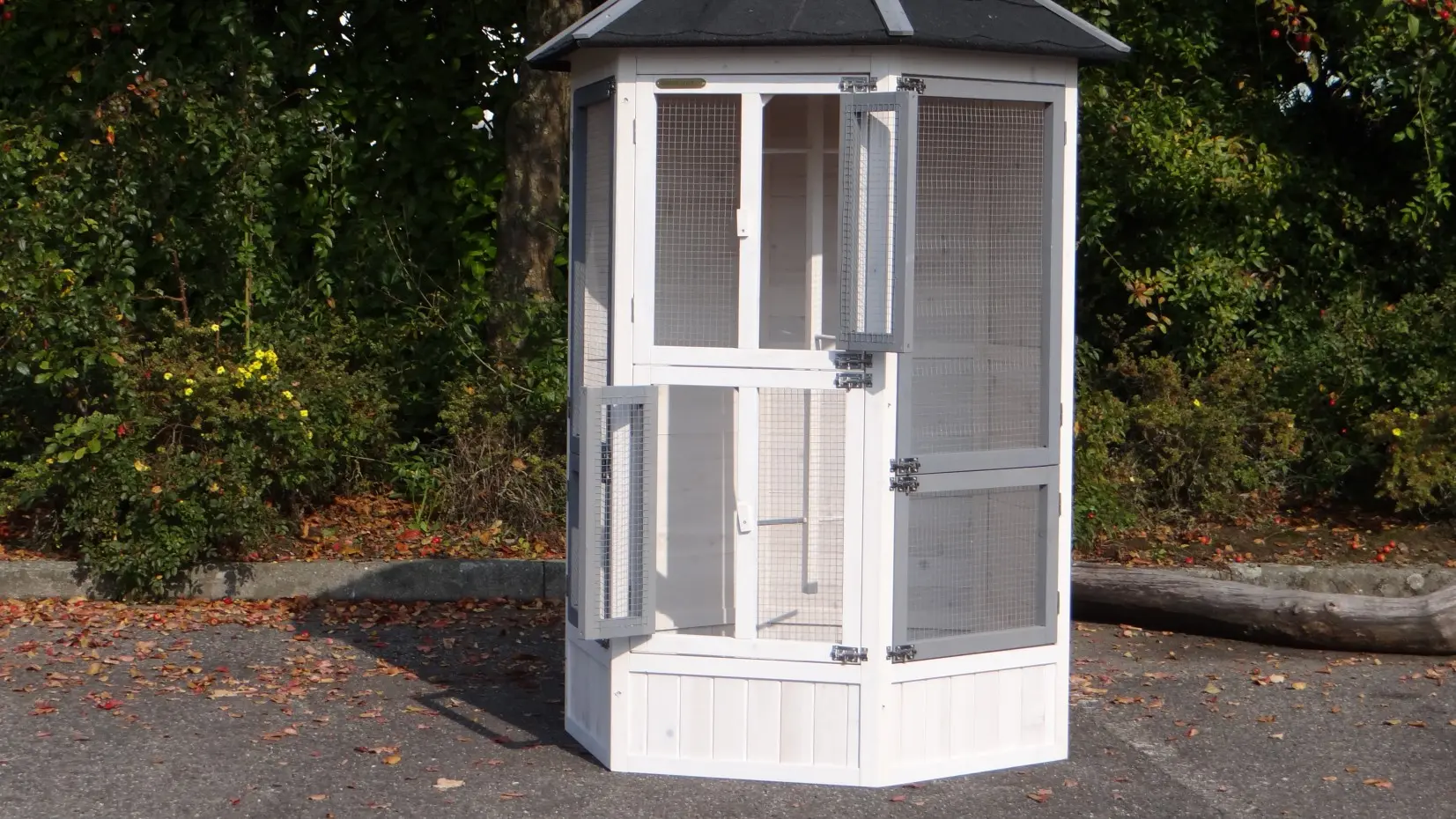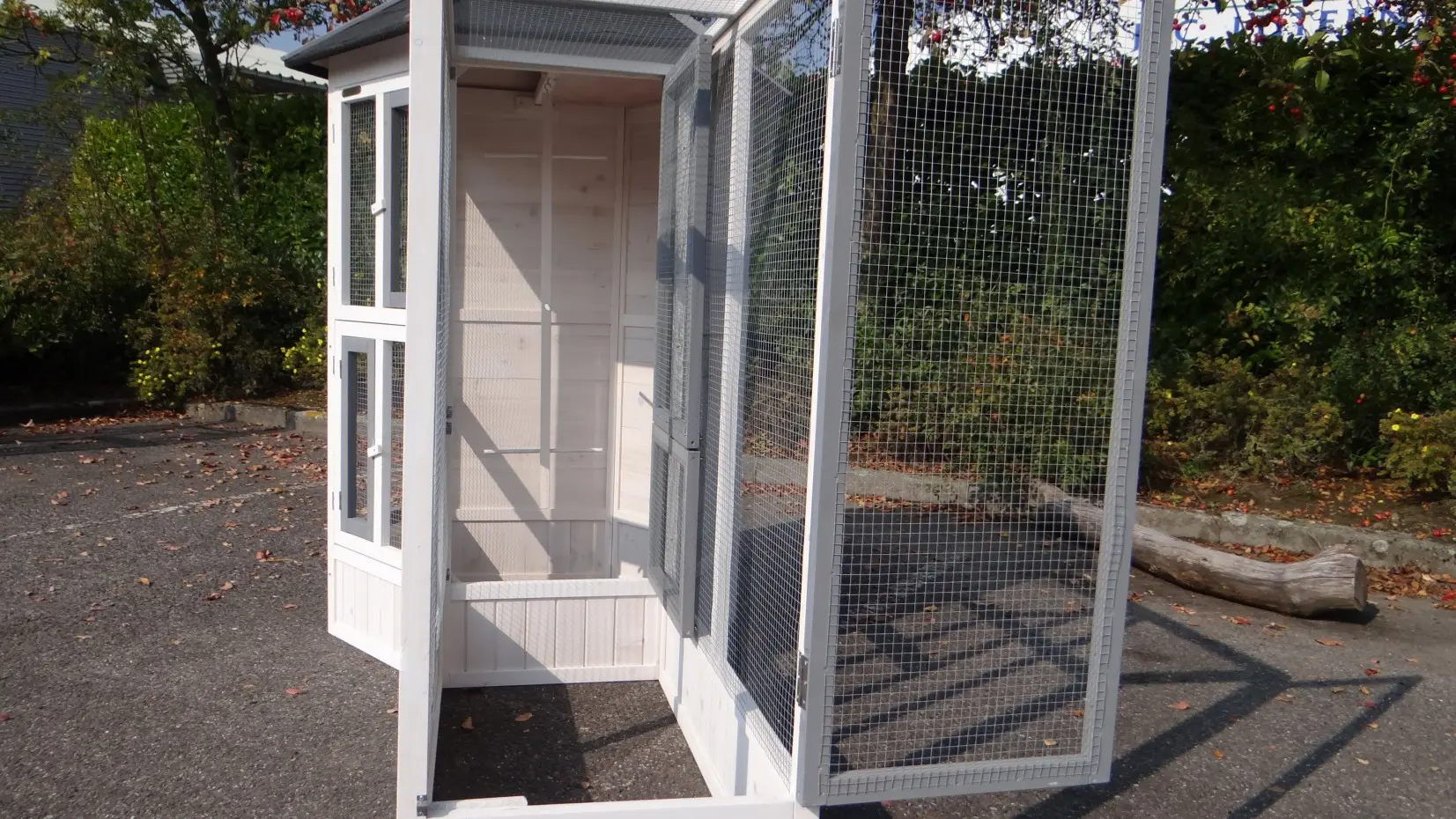 - Volière met draaibaar voedersysteem (incl. 2 bakjes), zodat de vogels zonder ontsnappingsgevaar gevoerd kunnen worden