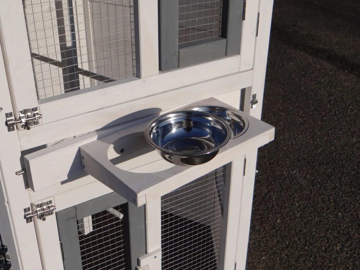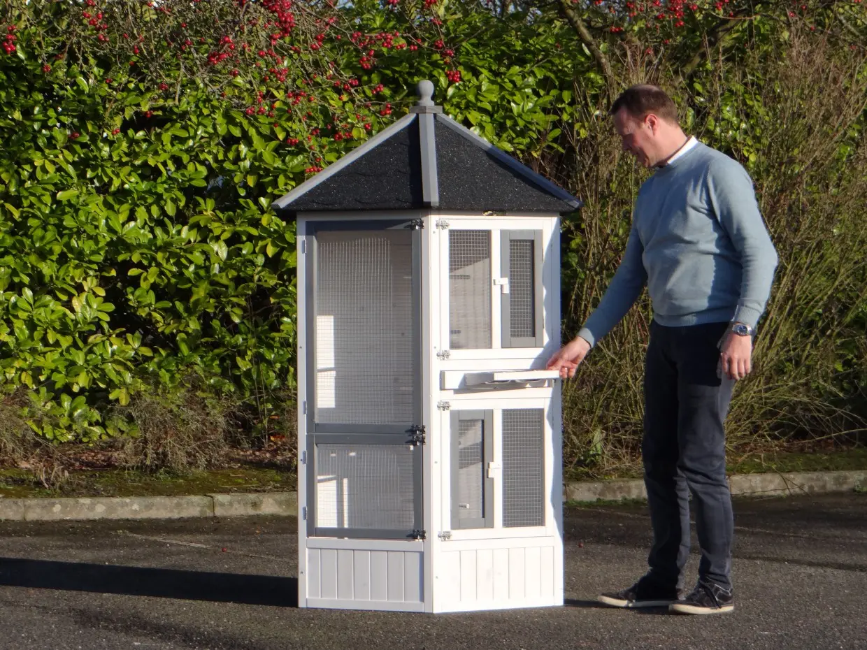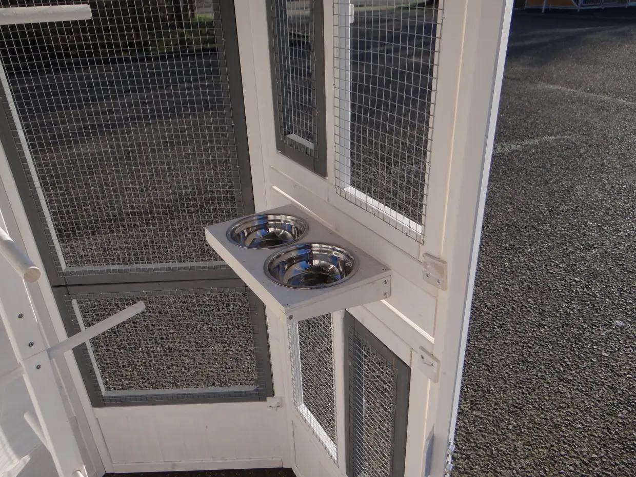 - Volière met draaibaar voedersysteem (incl. 2 bakjes), zodat de vogels zonder ontsnappingsgevaar gevoerd kunnen worden