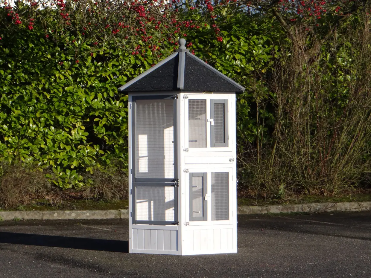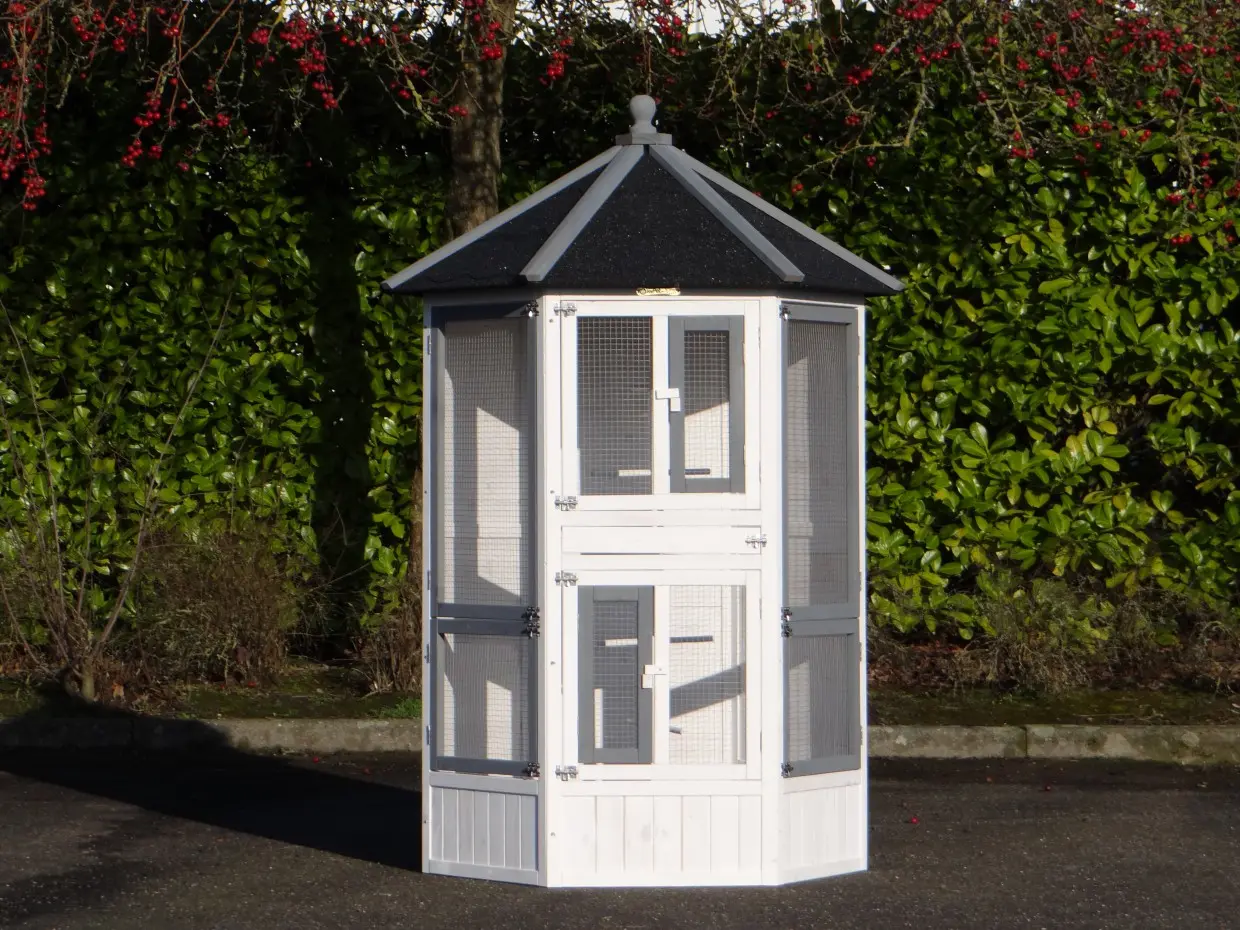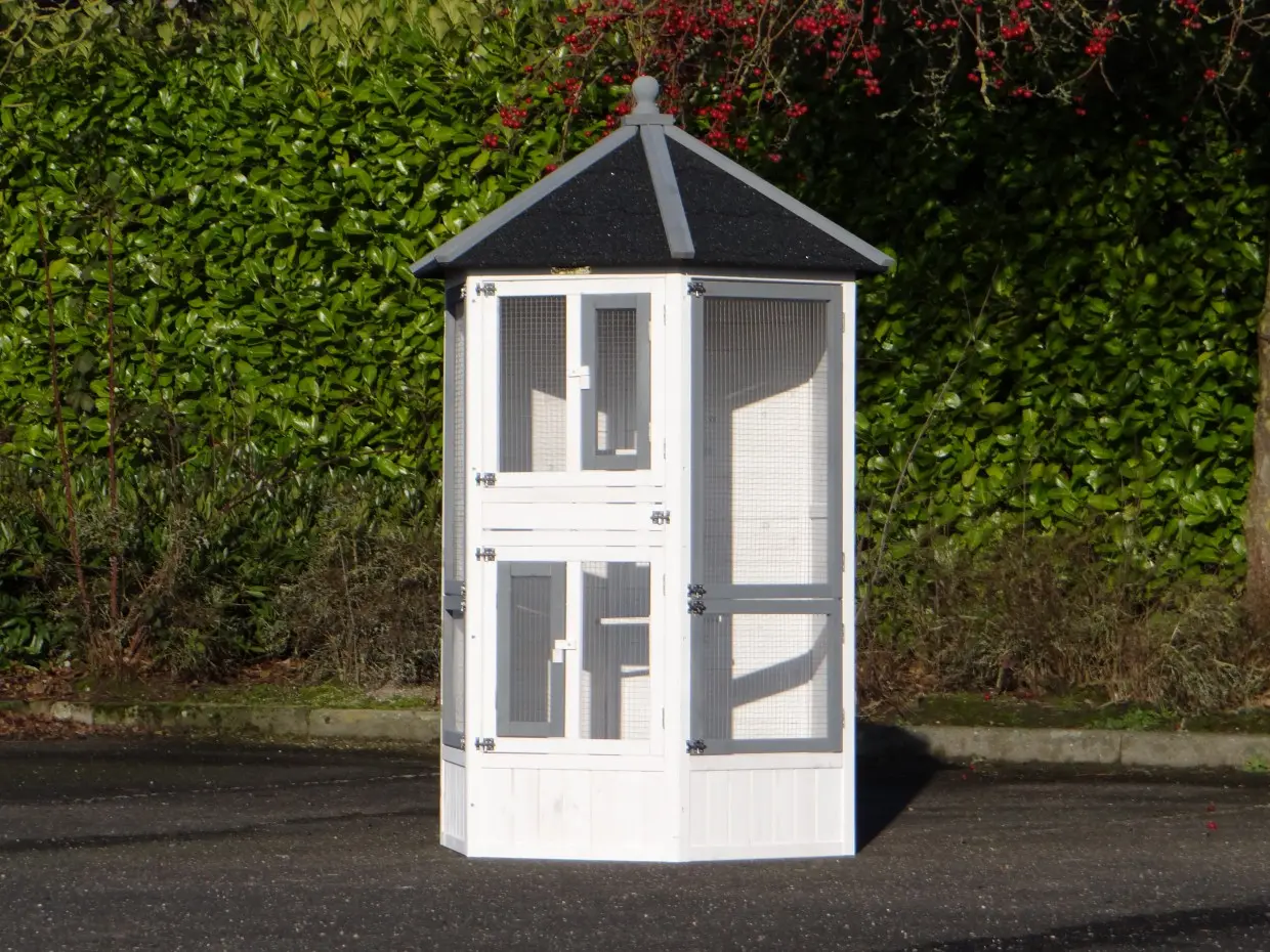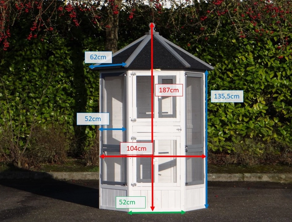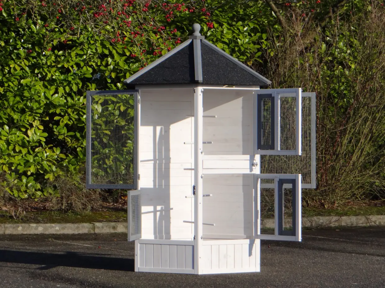 De zeshoekige Volière Hannah is een prachtige, hexagonale volière. In deze mooie en luxe zeskantige volière kunnen diverse soorten tropische vogels of kanaries gehuisvest worden. Deze vogelkooi heeft 6 grotere deuren en 2 kleine, praktische deurtjes. Boven in deze volière zitten 2 nestkasten. Tevens heeft deze volière 5 zitstokken. De Hannah is door de zeshoekige vormgeving een zeer fraaie voliere.