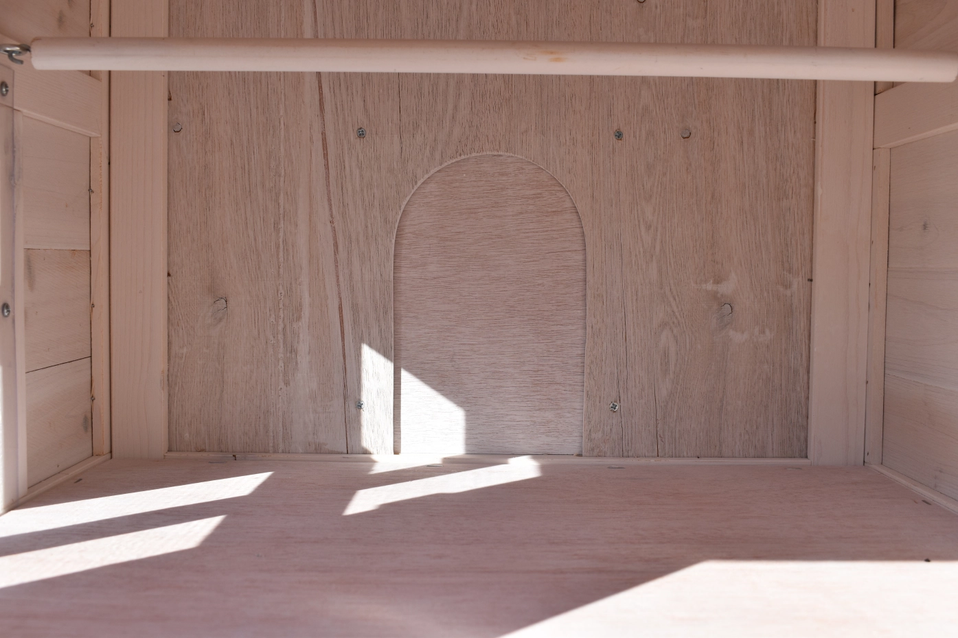 Het voor uw product gebruikte hout is een uniek natuurproduct wat in het land van herkomst, na zorgvuldige selectie, op ambachtelijke wijze is verwerkt. Het is karakteristiek en uniek in elk opzicht. Dit houtproduct heeft bovendien een handmatige bewerking ondergaan. Geen enkel stuk hout is gelijk van vorm, structuur of kleur, zodat kleurschakeringen zelfs binnen één stuk hout onvermijdelijk zijn. Windbarsten, haarscheuren, oneffenheden en de aanwezigheid van grote en kleine noesten getuigen van hun oorsprong en jarenlange groei. Oneffenheden zijn meestal handmatig bijgewerkt met houtvulling. Door gebruik en door invloed van licht zullen nieuwe dierenverblijven na verloop van tijd een warmere kleur krijgen. Kleurverschillen onderling en ten opzichte van het showmodel zijn daarom voor de hand liggend. Het product is voorzien van een beitsafwerking in de kleuren zoals op de foto. U dient het hout nogmaals te beitsen om schimmelvorming en rotting te voorkomen. Beits kunt u direct handig meebestellen.